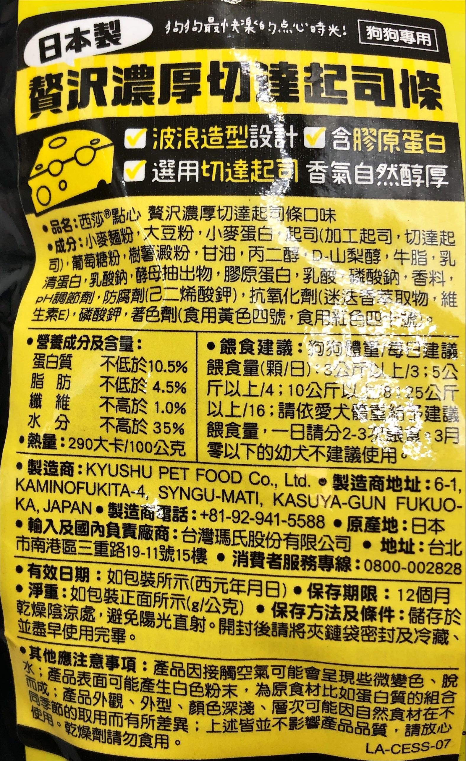 - - 西莎起司條口感豐富,讓您的愛犬享受每一口濃郁的起司風味,快樂無比。