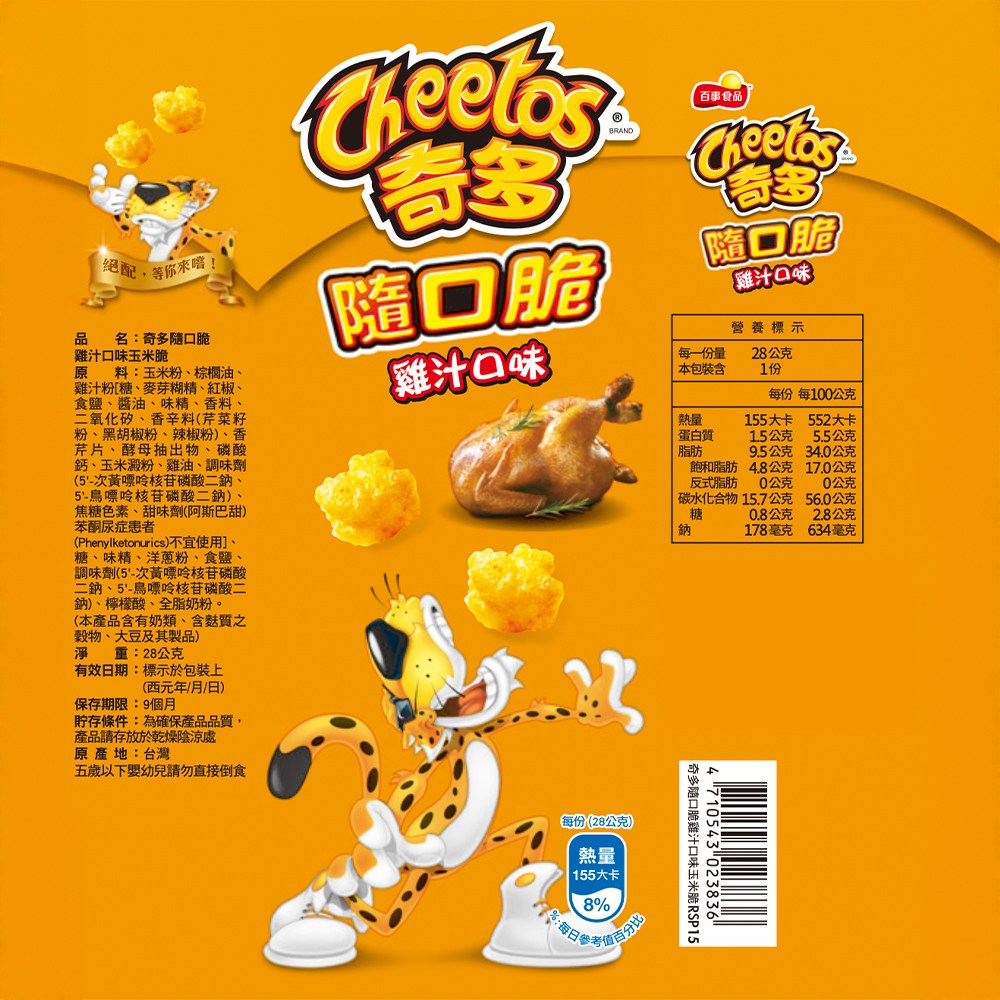 奇多隨口脆,是一款令人難以抗拒的美味零食。酥脆的玉米脆片,搭配雙倍濃郁的起司風味,每一口都充滿幸福感。獨立小包裝設計,方便攜帶與分享,隨時隨地享受美味。無論是辦公室、戶外活動或居家休閒,奇多隨口脆都是您的最佳零食選擇。濃郁的起司香氣與酥脆口感,讓您一口接一口,欲罷不能