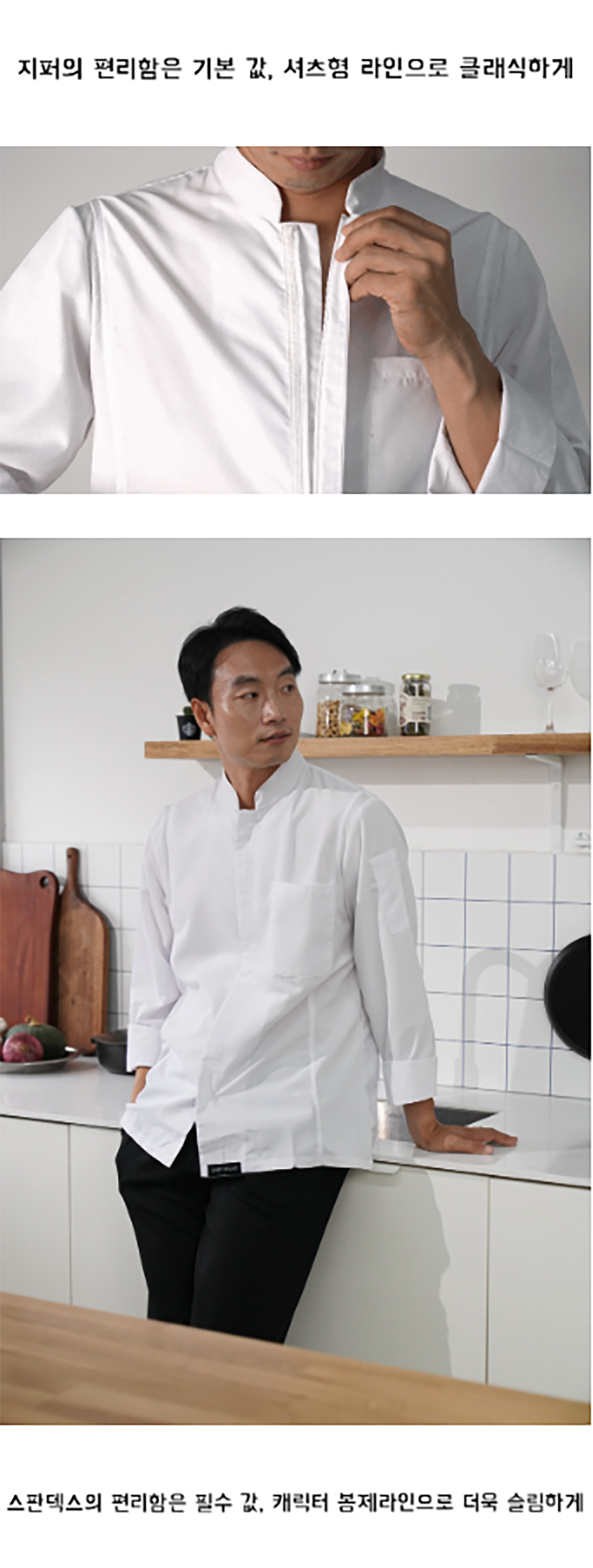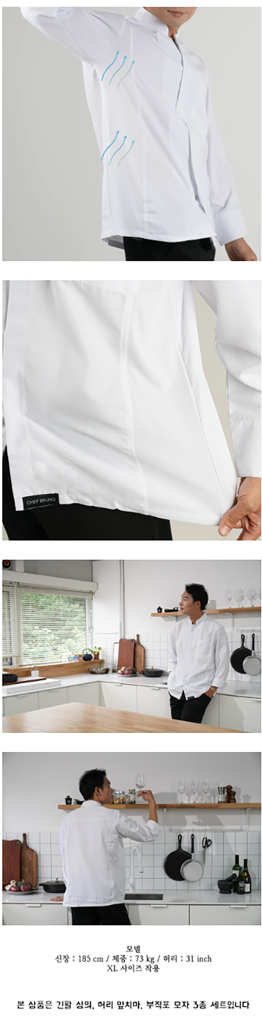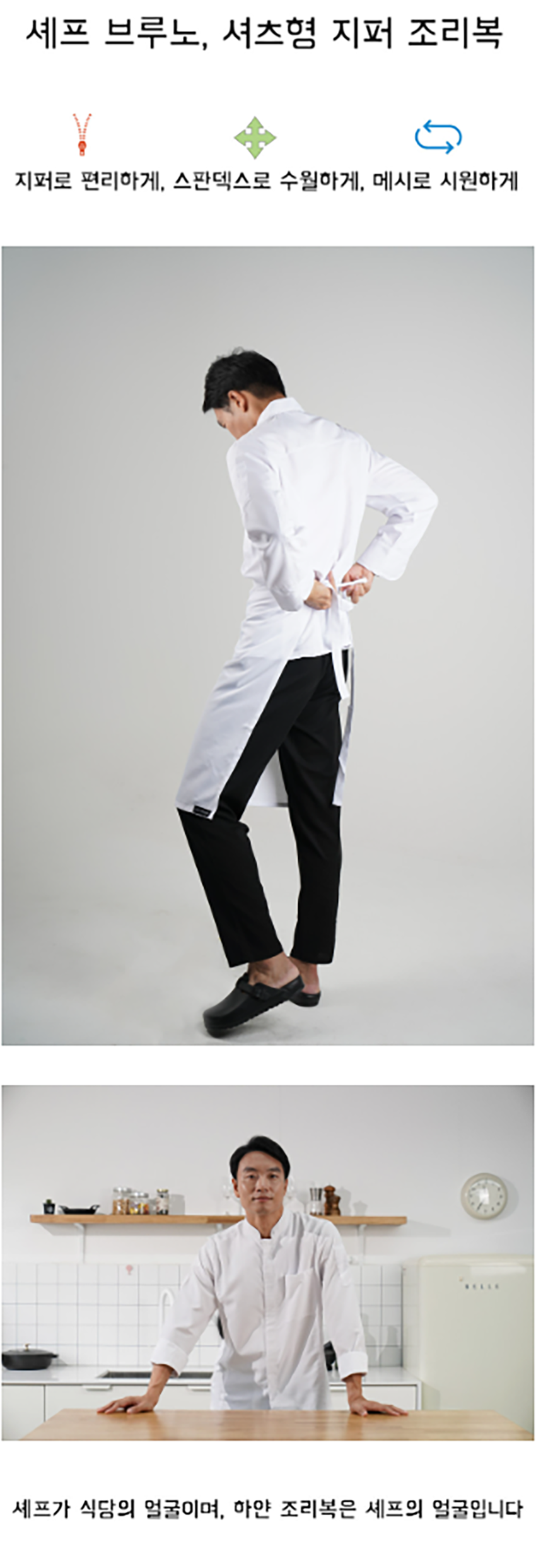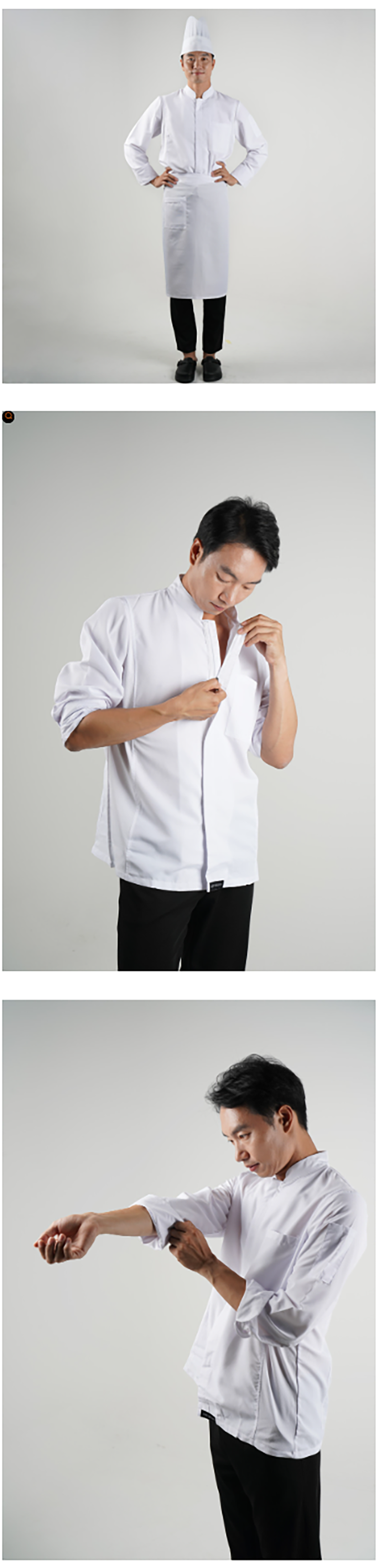 ChefBruno白色長袖拉鍊廚師服套裝,為您打造專業且舒適的廚房形象。採用襯衫式拉鍊設計,方便穿脫,節省時間。彈性纖維材質搭配特色縫線,讓版型更修身,展現俐落風格。網眼設計提供良好的透氣性,即使在快節奏的工作環境下也能保持乾爽舒適。本產品包含長袖上衣、腰部圍裙及不織布帽子,一次購足,經濟實惠。適合餐廳主廚及餐飲從業人員。