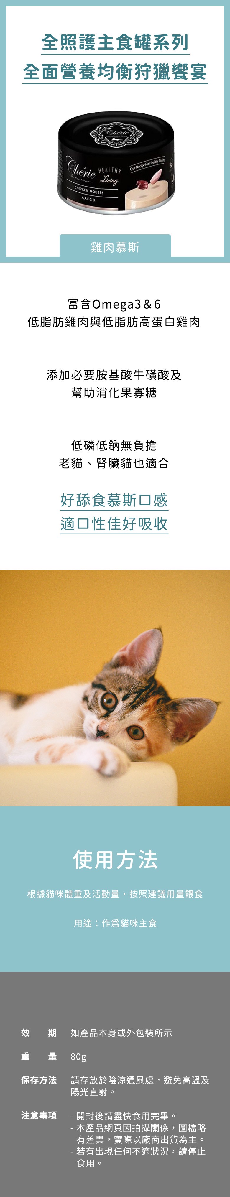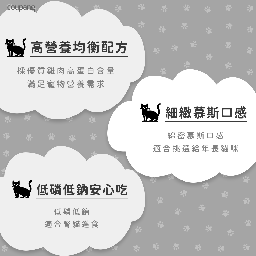 - 慕斯質地細緻滑順,讓貓咪輕鬆享受每一口,適口性極佳,滿足牠們挑剔的味蕾。