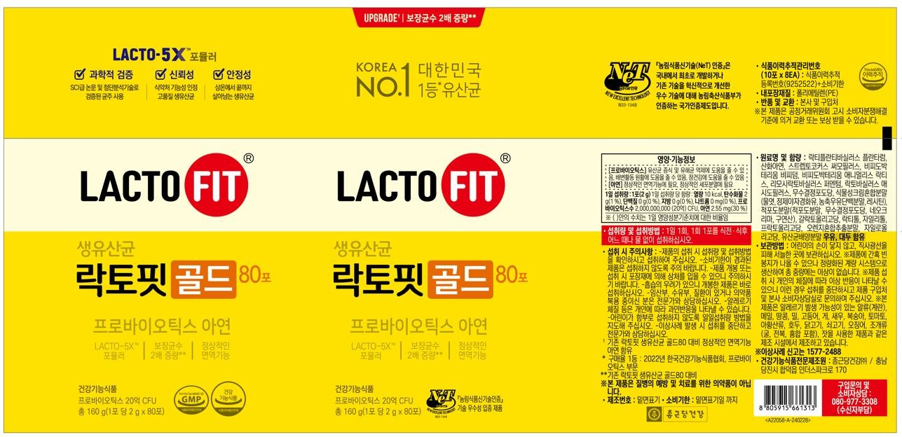 鍾根堂LACTO-FIT Gold益生菌粉,來自韓國第一乳酸菌品牌,採用升級LACTO-5X配方,每包含有20億CFU活性益生菌及鋅,有助於維持消化道機能,促進新陳代謝,提升保護力。獨立隨身包設計,方便攜帶及食用,不需配水即可直接服用,隨時補充好菌,維持菌叢平衡。本產品獲得韓國農林畜產食品部新技術認證,品質有保障,全家大小皆可安心食用,讓您輕鬆擁有健康好體質。