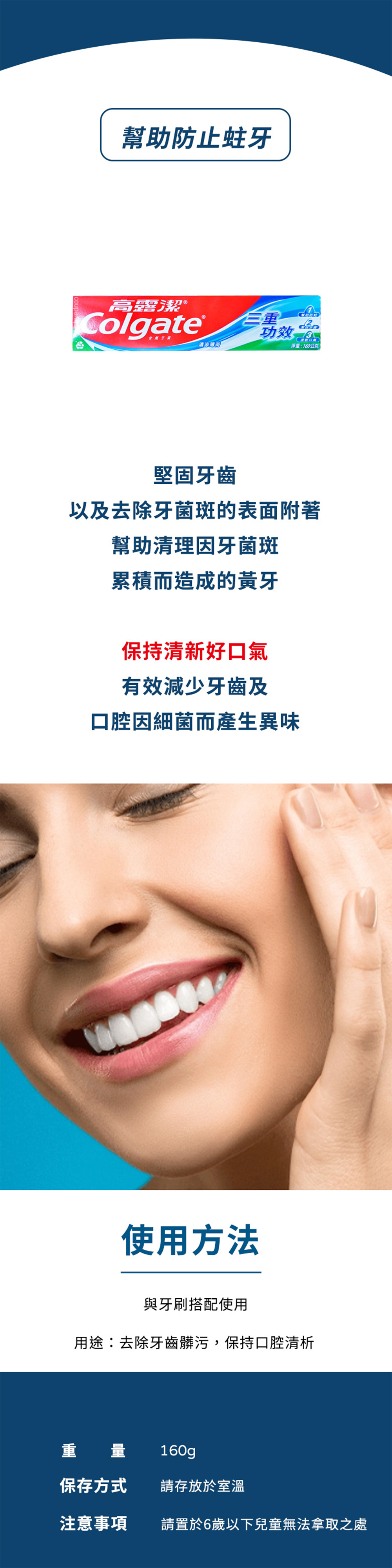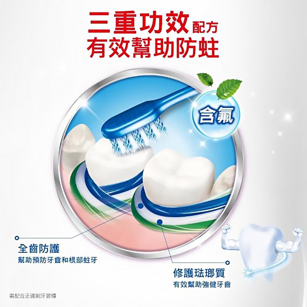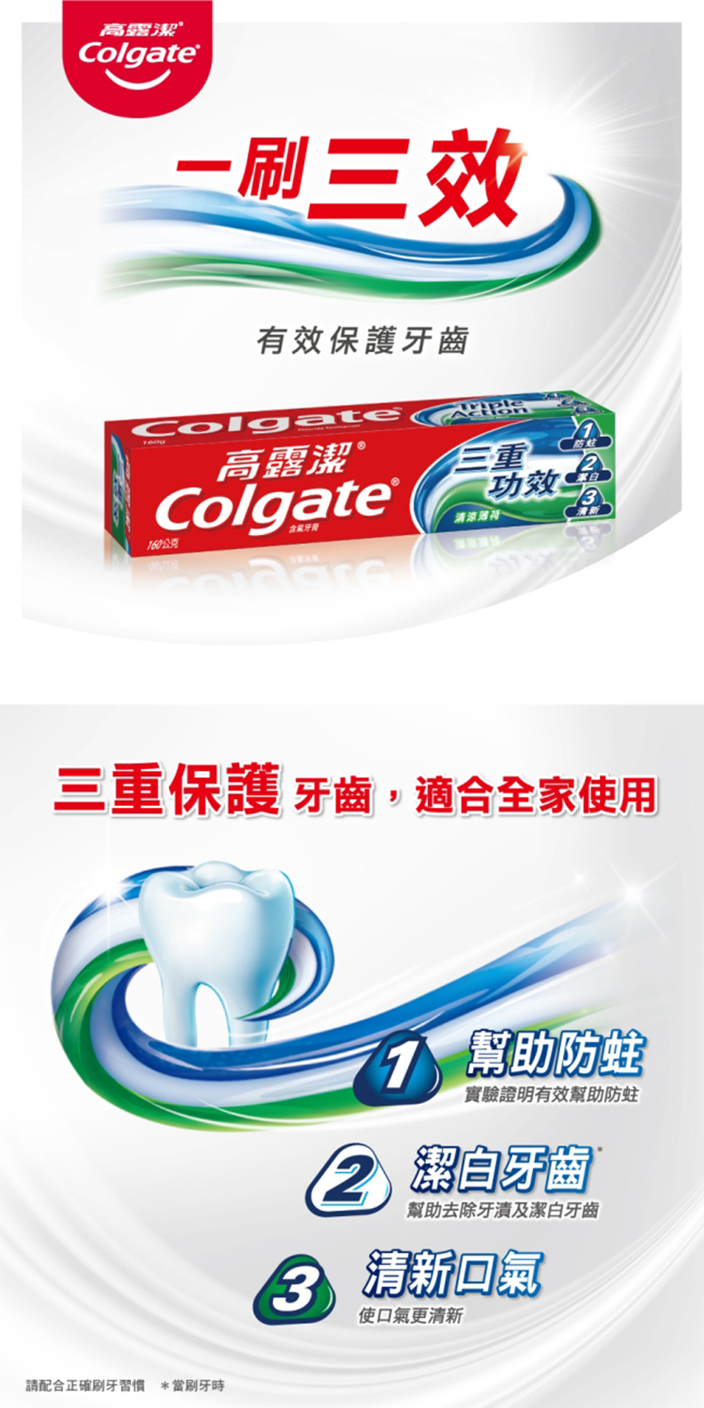 - 三重功效牙膏幫助去除牙菌斑,保持口腔清潔,減少牙齦問題發生。