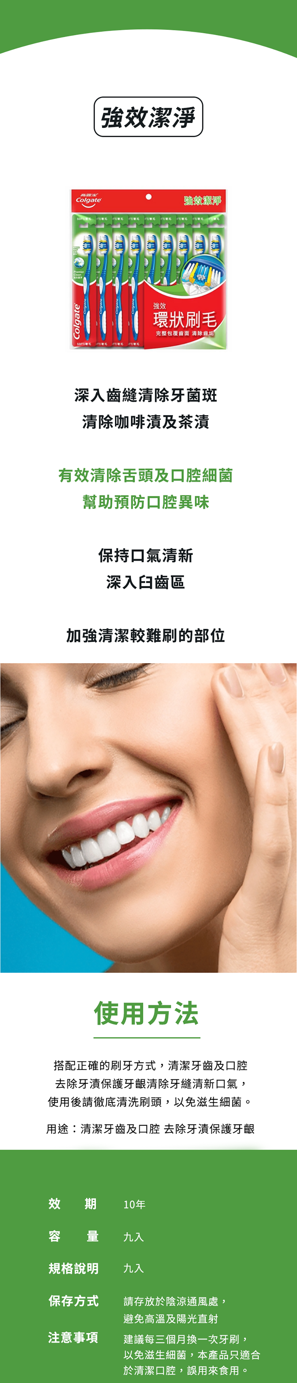 - 獨特環狀刷毛設計,能更完整包覆牙齒表面,深入清潔牙縫,徹底清除牙菌斑。