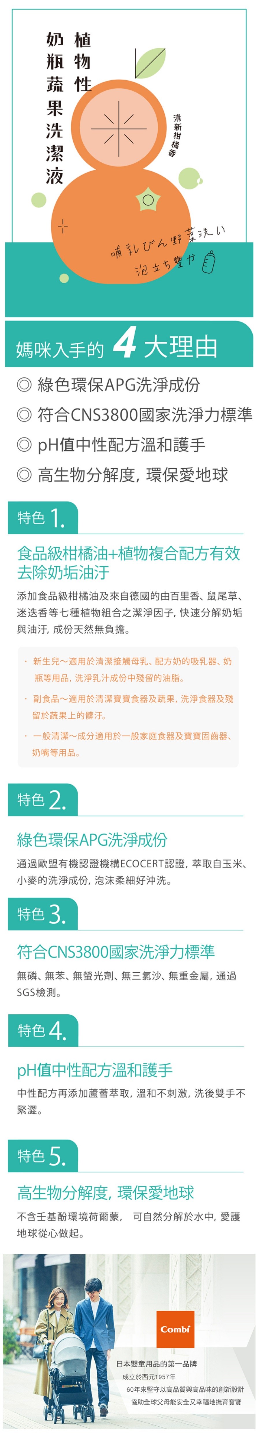 康貝植物性奶瓶蔬果洗潔液補充包,800ml大容量,是您呵護寶寶健康的首選。本產品採用食品級柑橘油及多種植物複合配方,能有效去除奶垢油污,讓奶瓶、餐具煥然一新,無磷、無苯、無螢光劑、無三氯沙、無重金屬,通過SGS檢測,符合CNS3800國家洗淨力標準,給寶寶最安心的呵護。中性配方添加蘆薈萃取,溫和不刺激,洗後雙手不緊繃。此外,本產品不含壬基酚環境荷爾蒙,可自然分解於水中。