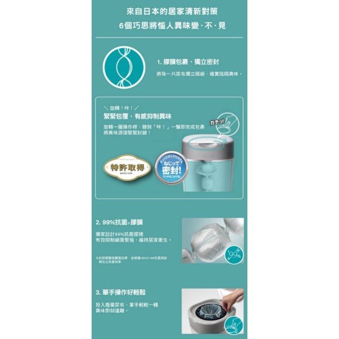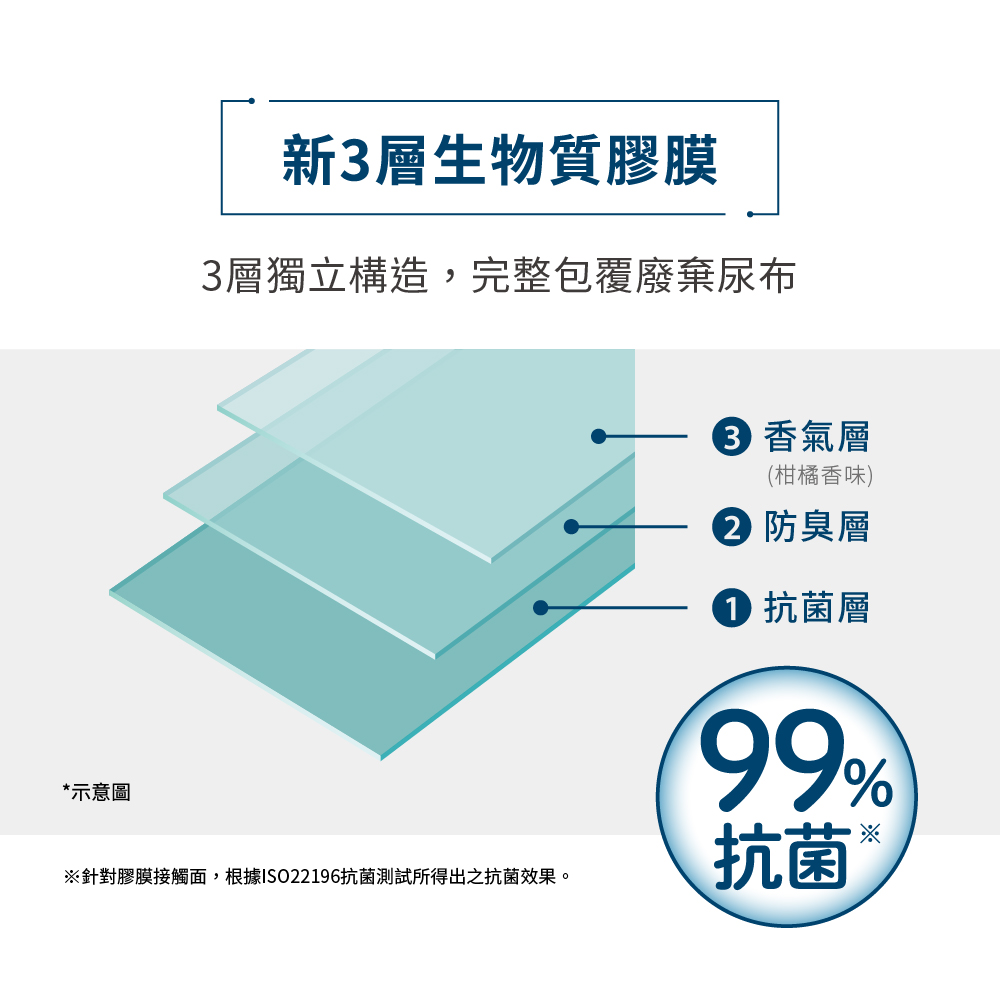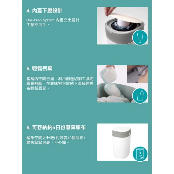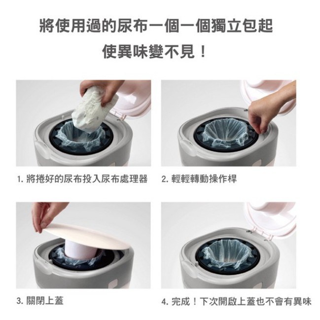 - 膠捲式設計,輕鬆包覆髒尿布,單手操作更方便,育兒生活更輕鬆。