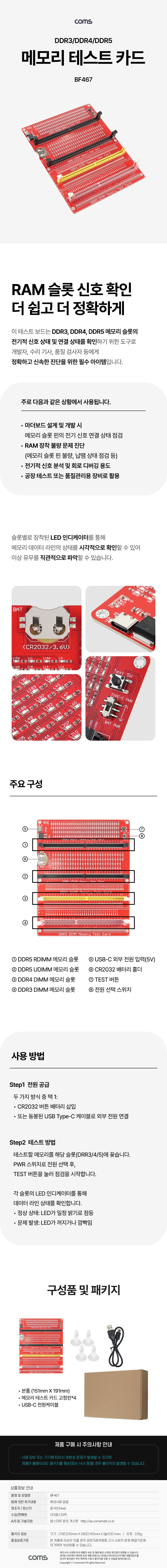 Coms 賣場 RAM 故障問題診斷記憶體測試卡 BF467,是專為檢測 DDR3、DDR4、DDR5 記憶體插槽電氣信號和連接狀態而設計的工具。透過各插槽安裝的 LED 指示燈,使用者可以直觀地確認記憶體資料線路的狀態,快速掌握異常原因。此測試卡適用於主機板設計開發、RAM 安裝不良問題診斷、電氣信號分析及電路除錯等多種場景。無論是開發人員、維修技師還是品質檢驗員,都能利用此工具準確、快速地診斷問題。產品包含本體、記憶體測試卡固定針及 USB-C 電源纜線。