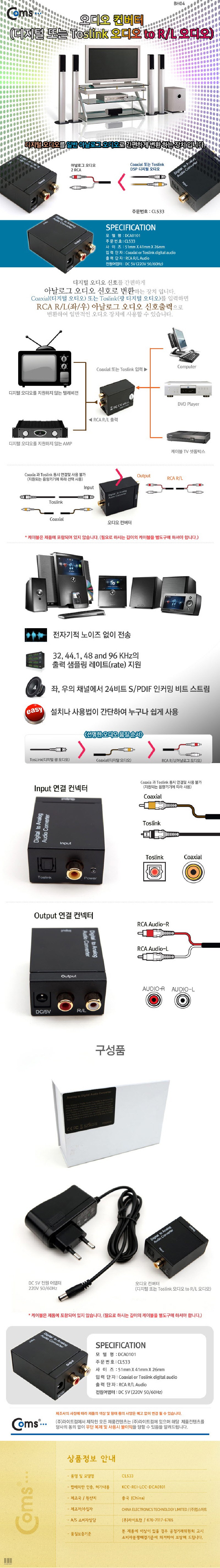 Coms Mart 音訊轉換器讓您輕鬆連接數位與類比音訊設備。這款轉換器能將同軸或光纖數位音訊轉換為 RCA R/L 類比音訊,讓您的舊音響也能享受數位音訊的清晰音質。體積小巧,安裝簡便,非常適合家庭影音娛樂。不論是DVD播放機還是機上盒,都能輕鬆連接,提升您的聽覺體驗。請注意,本產品不包含音源線,需另行購買。