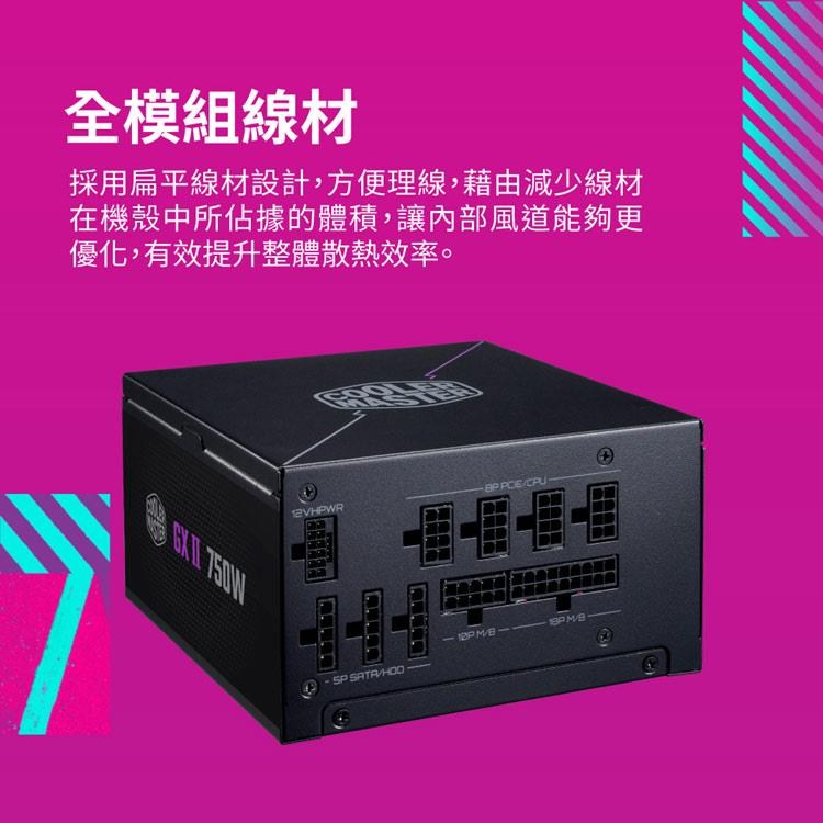 - 酷碼GX2 750W電源具備全模組化設計,輕鬆客製化您的電腦組裝,打造整潔有序的內部空間。