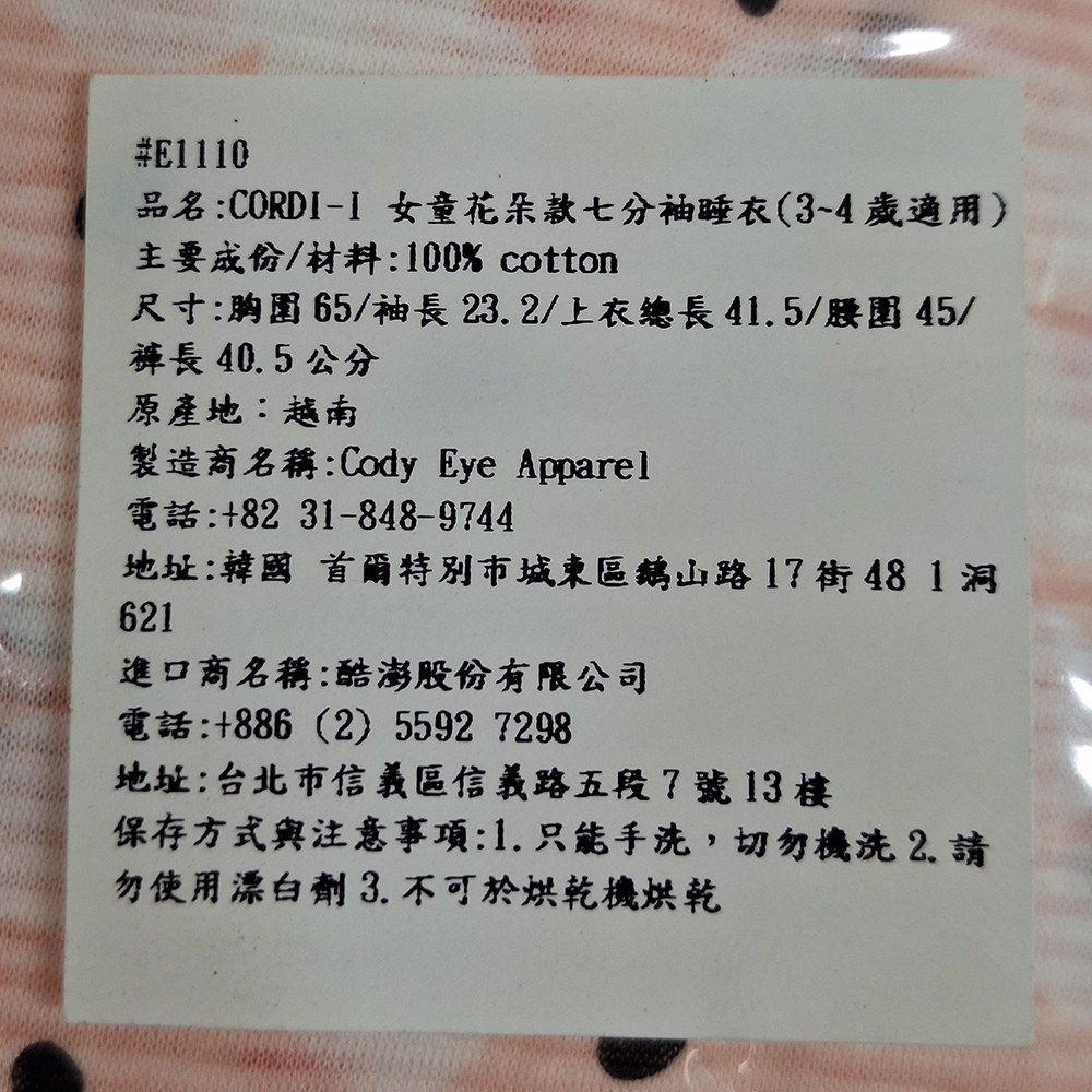 Cordi-i女童七分袖居家服,採用柔軟舒適的棉質布料,呵護寶貝嬌嫩的肌膚。可愛的花朵圖案設計,增添童趣,讓孩子愛不釋手。七分袖長度,適合各種季節穿著,居家外出皆宜。110號尺寸,適合3-4歲的女童。讓您的寶貝穿上這款舒適又可愛的居家服,享受無拘無束的快樂時光。