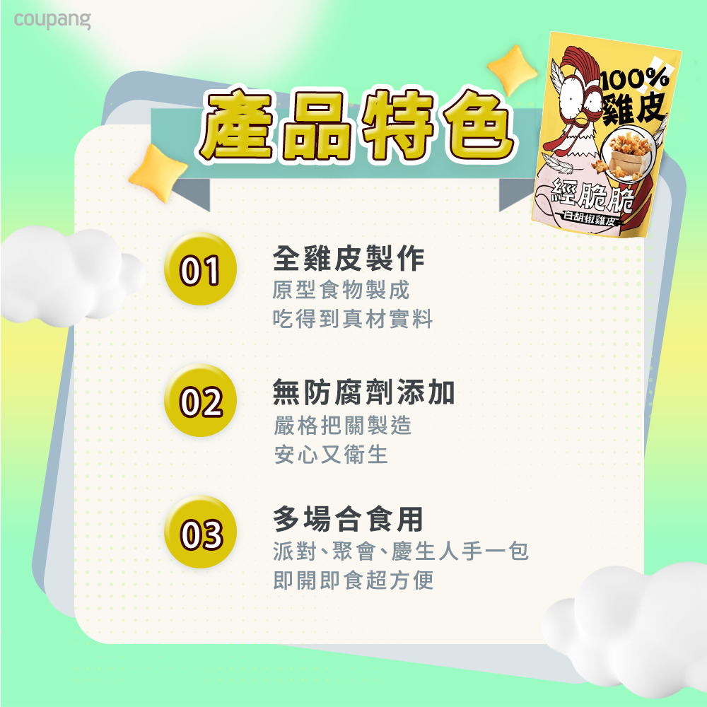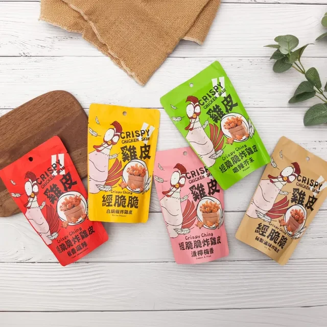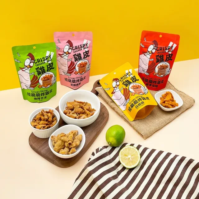 - 嚴選新鮮雞皮,經過特殊工法製作,保留雞皮的原始風味,口感酥脆不油膩。