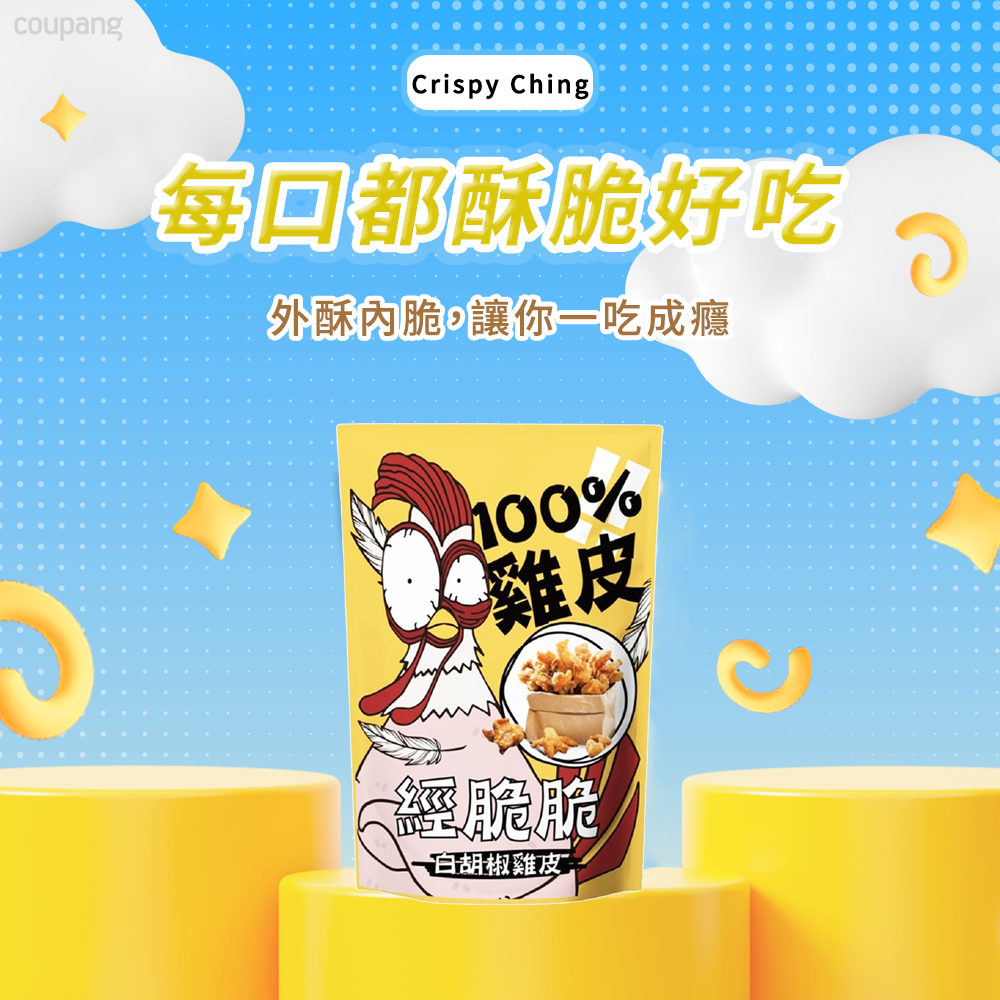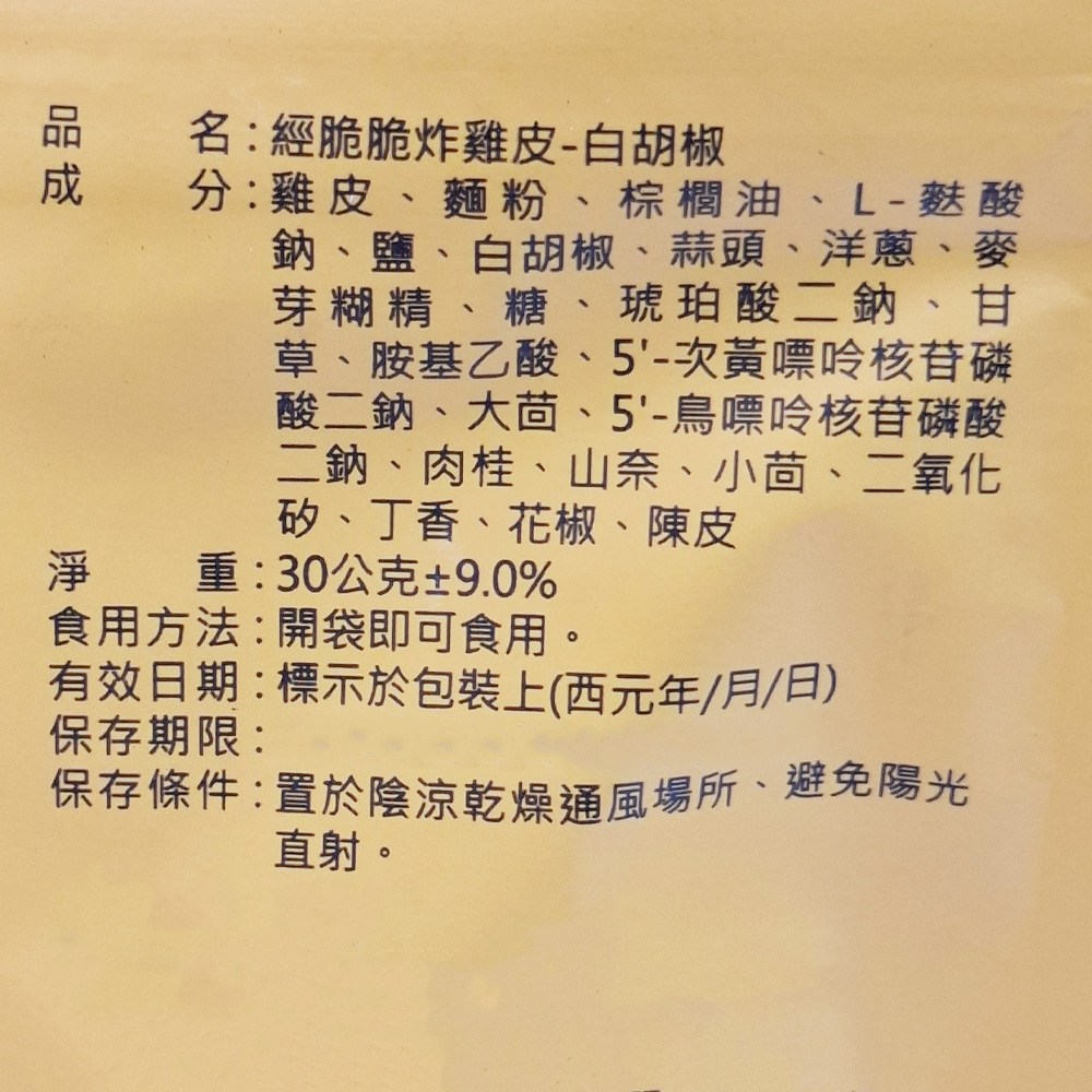 想來點不一樣的酥脆口感嗎?經脆脆白胡椒雞皮,將帶給你前所未有的味蕾體驗!嚴選新鮮雞皮,經過獨家工藝炸至金黃酥脆,再撒上香氣濃郁的白胡椒,每一口都充滿了卡滋卡滋的聲響與胡椒的辛香。30g輕巧包裝,方便攜帶,隨時隨地滿足你的味蕾。無論是追劇、辦公、還是朋友聚會,經脆脆白胡椒雞皮都是你的最佳零食夥伴。酥脆涮嘴,一口接一口,讓你愛不釋手!