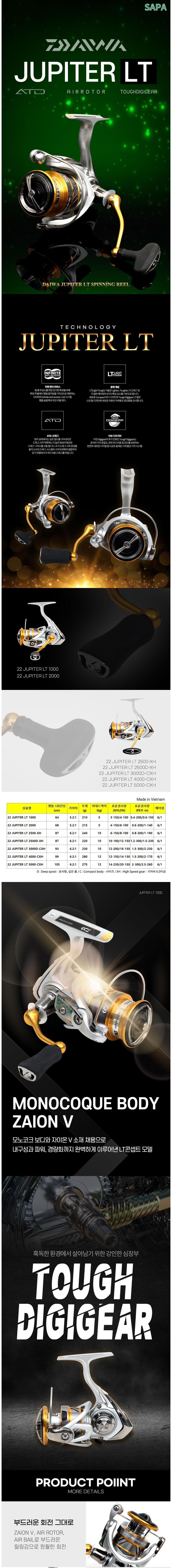DAIWA Jupiter捲線器採用LT (Light Tough) 輕量化設計,結合堅固的數位齒輪系統,提供卓越的耐用性和滑順度。ATD拖曳系統能根據魚的拉力自動調整,讓您在搏魚時更加得心應手。無限防反轉功能減少手把回滑,提升操作的精準度。無論是淡水或海水釣魚,JUPITER LT都能提供可靠的性能。輕巧的機身設計和高握力手把頭,讓您享受舒適的釣魚體驗。越南製造。