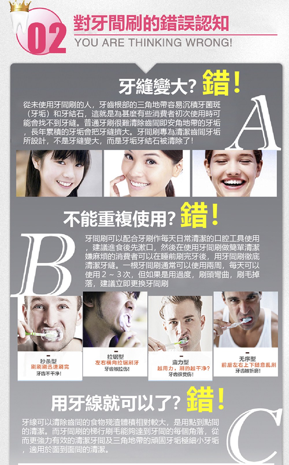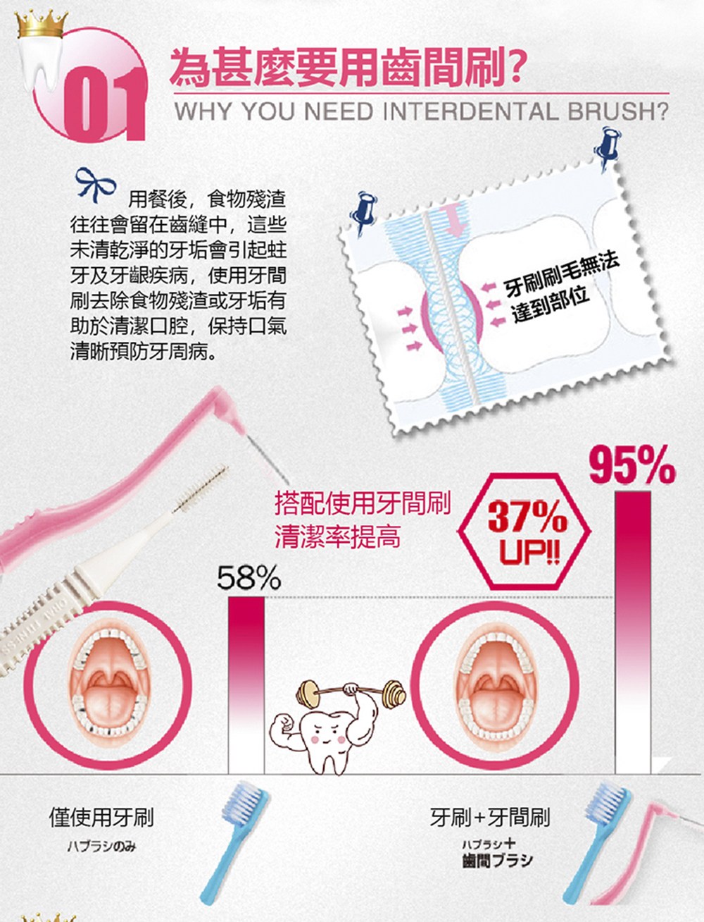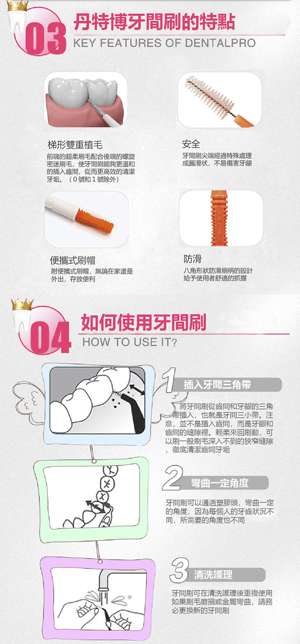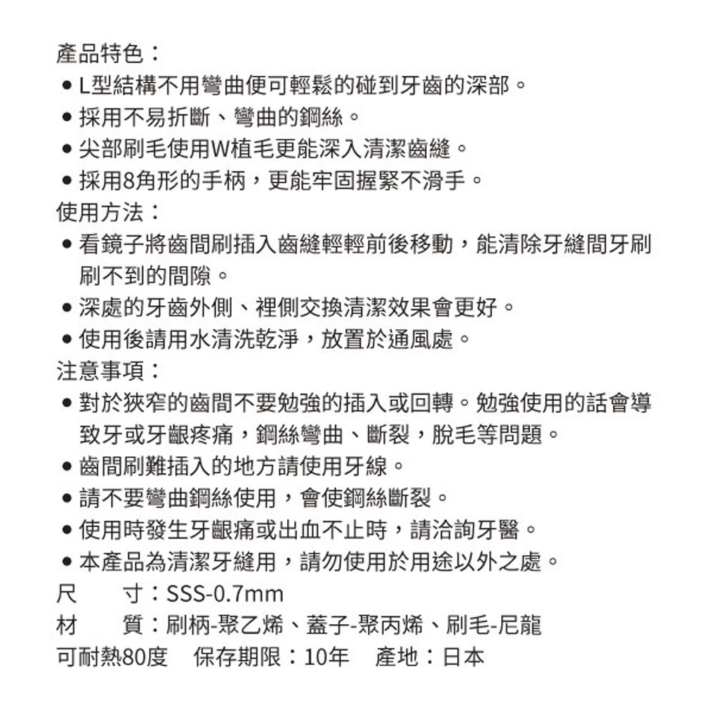 深入齒縫,清潔更徹底 清潔齒縫輕鬆上手 清潔牙菌斑 預防口臭及降低蛀牙發生率 超級細設計,適合初次使用者 預防牙齦發炎 依照不同年齡層的齒縫及個人牙齒不同齒縫的全尺寸設計,能清潔牙菌斑, 預防及協助治療牙周病,獨特雙重刷毛,能夠深入牙齒齒縫,清除牙菌斑, 刷頭頸部有彈性可彎曲,讓您清潔臼齒齒縫不費力,預防口臭及降低蛀牙發生率。