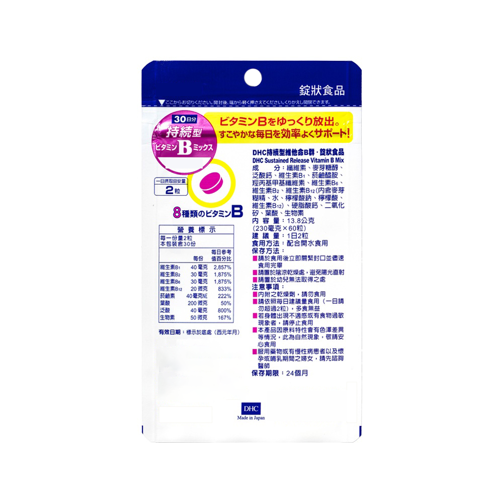 - DHC持續型維他命B群,緩慢釋放,營養更持久,告別快速流失的困擾。