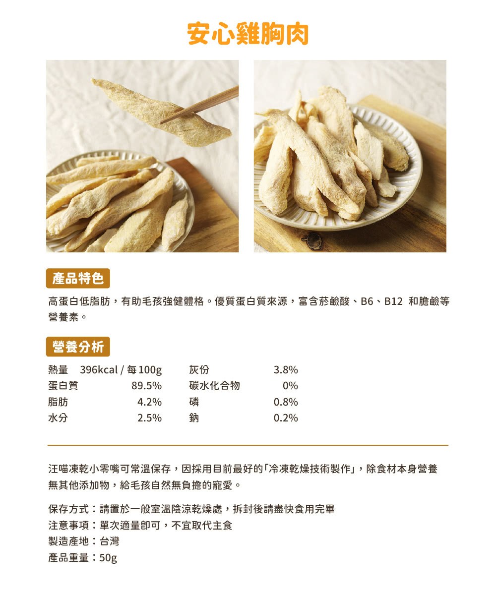 - 口感酥脆,凍乾技術保留雞胸肉的原始風味,讓毛孩愛不釋手,享受美味零食時光。