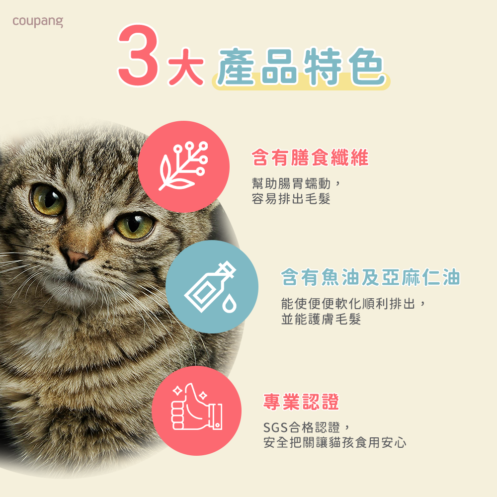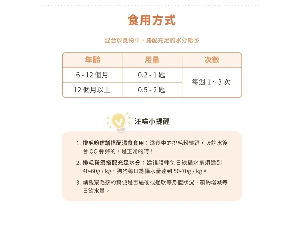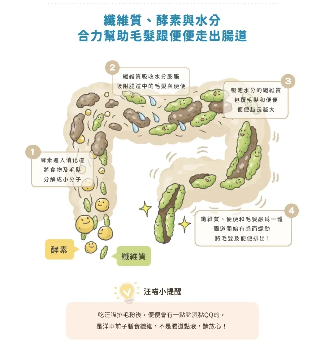 - 添加豐富膳食纖維,促進腸道蠕動,溫和幫助毛髮排出,減少不適感。