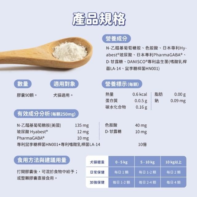 - 含專利GABA,幫助舒緩情緒,減少因壓力造成的生理不適,讓毛孩放鬆享受每一天。