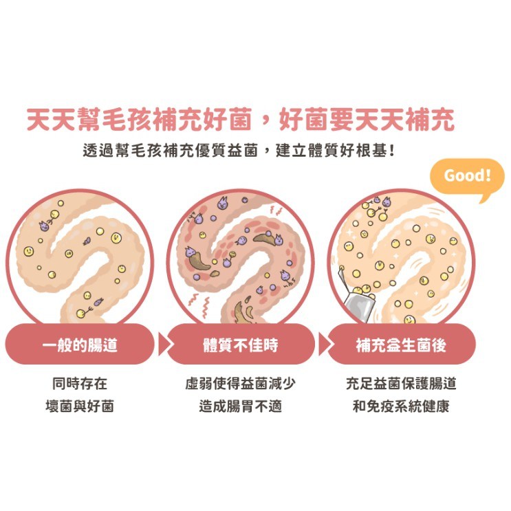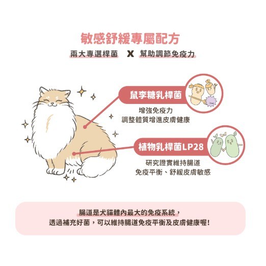 - 內含多種專利益生菌,能有效調整體質,提升毛孩的自然防禦力,遠離皮膚問題。