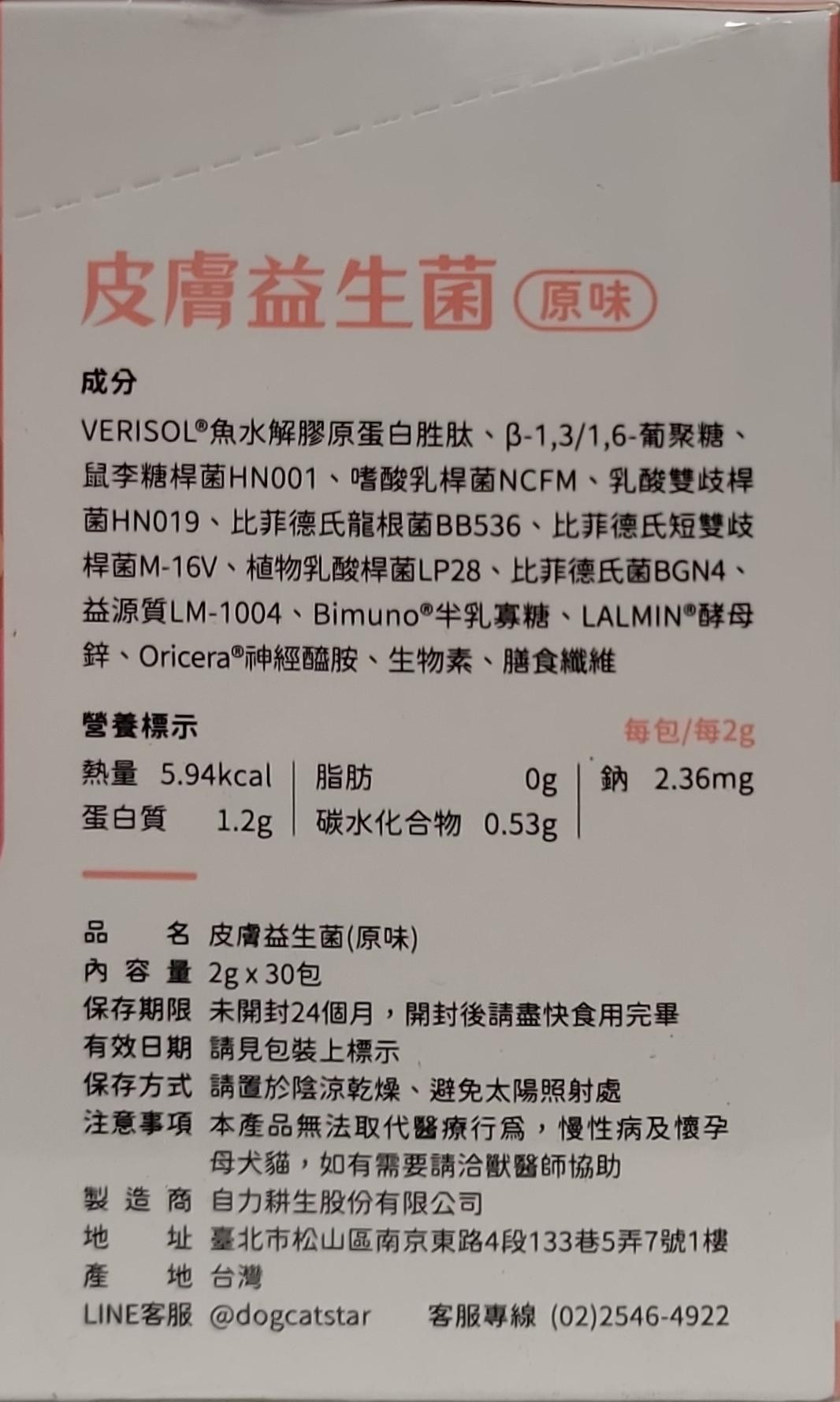 - 專為犬貓設計的皮膚益生菌,美味粉末讓毛孩每天開心補充,維持皮膚健康。