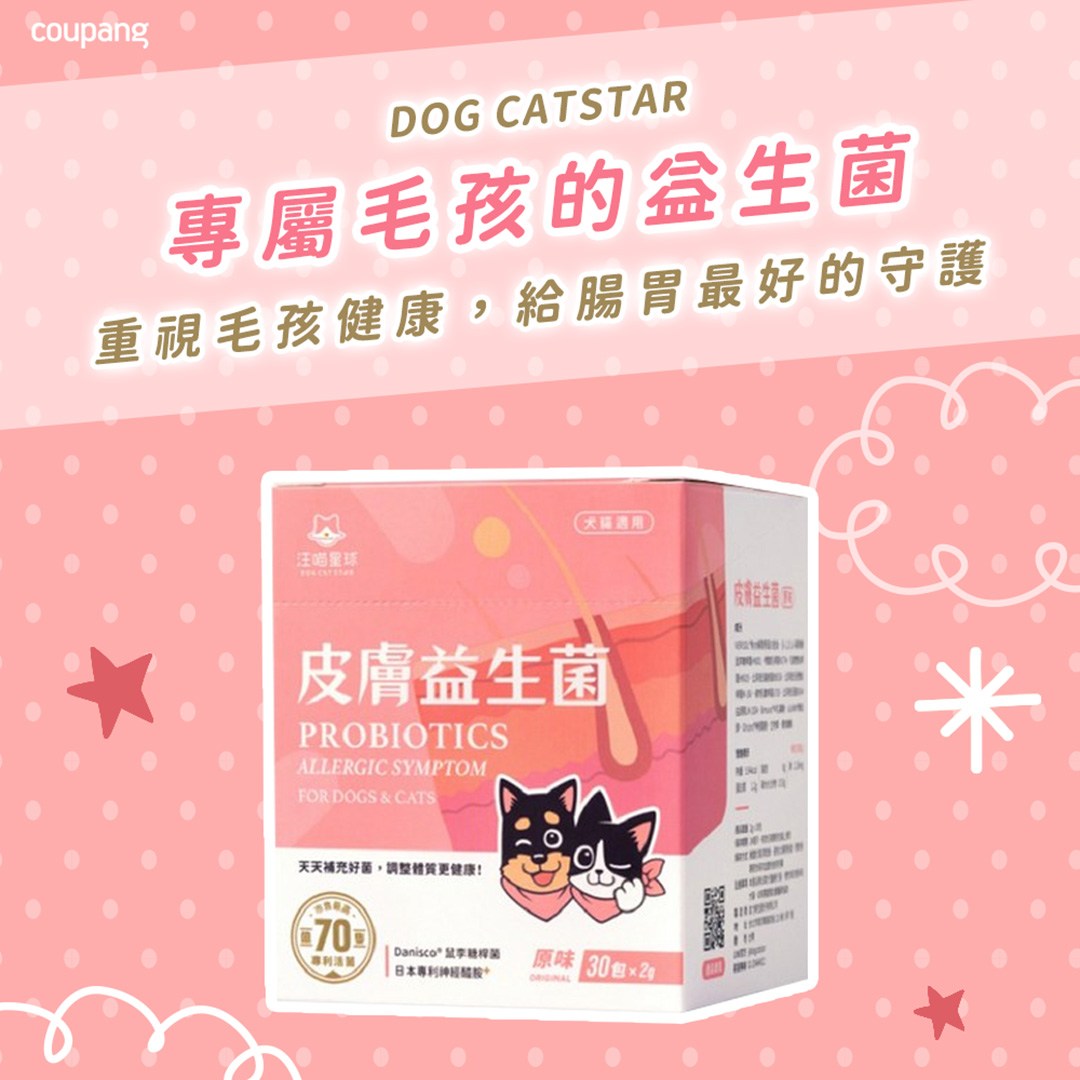 DOG CAT STAR 汪喵星球皮膚益生菌,專為呵護毛孩的皮膚健康而設計。每盒包含30包2克原味粉末,富含70億專利活性益生菌。本產品特別添加LP28益生菌、鼠李糖桿菌等成分,能有效調節免疫系統,維持皮膚屏障功能。無論是皮膚容易敏感,還是體質較弱的狗狗貓貓,都適合長期補充,讓毛孩由內而外散發健康光彩。食用方式簡單,可直接餵食或混於食物中,方便又美味。