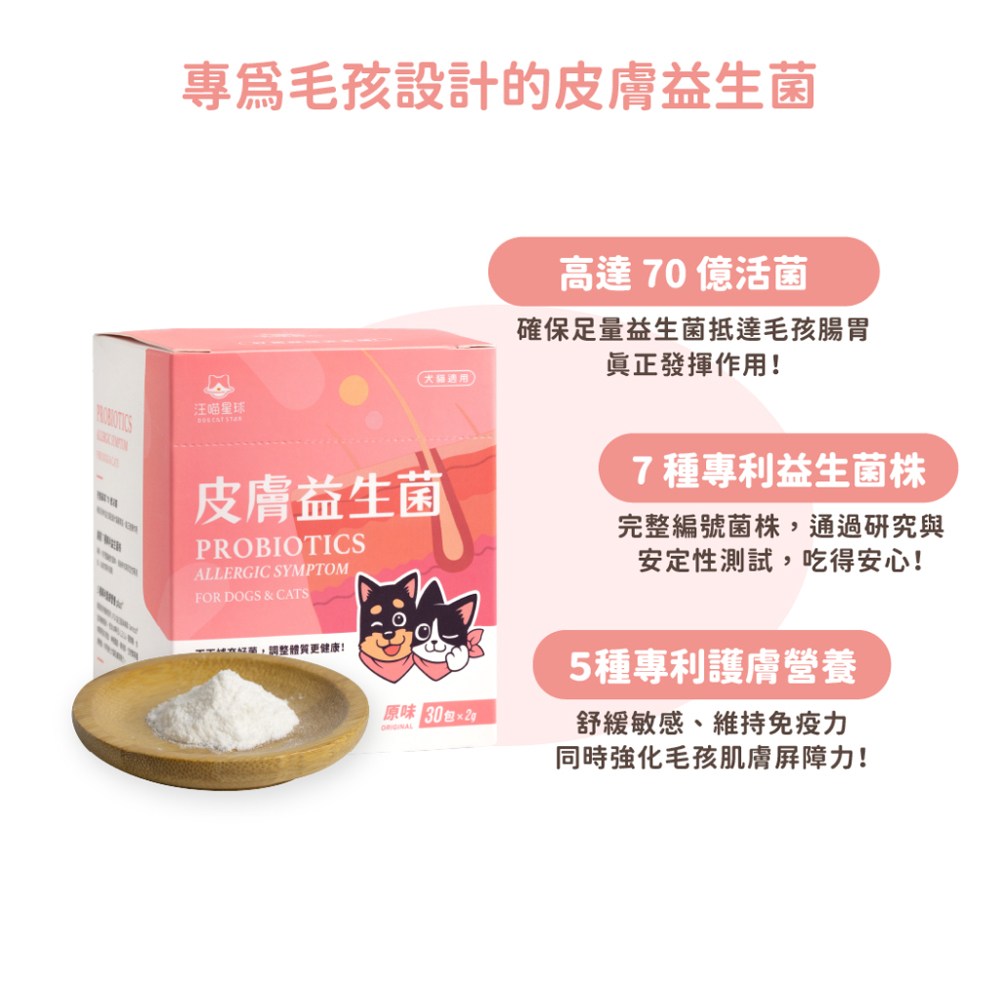 - 汪喵星球皮膚益生菌,有助於舒緩皮膚敏感,讓毛孩不再因搔癢而困擾,享受舒適生活。