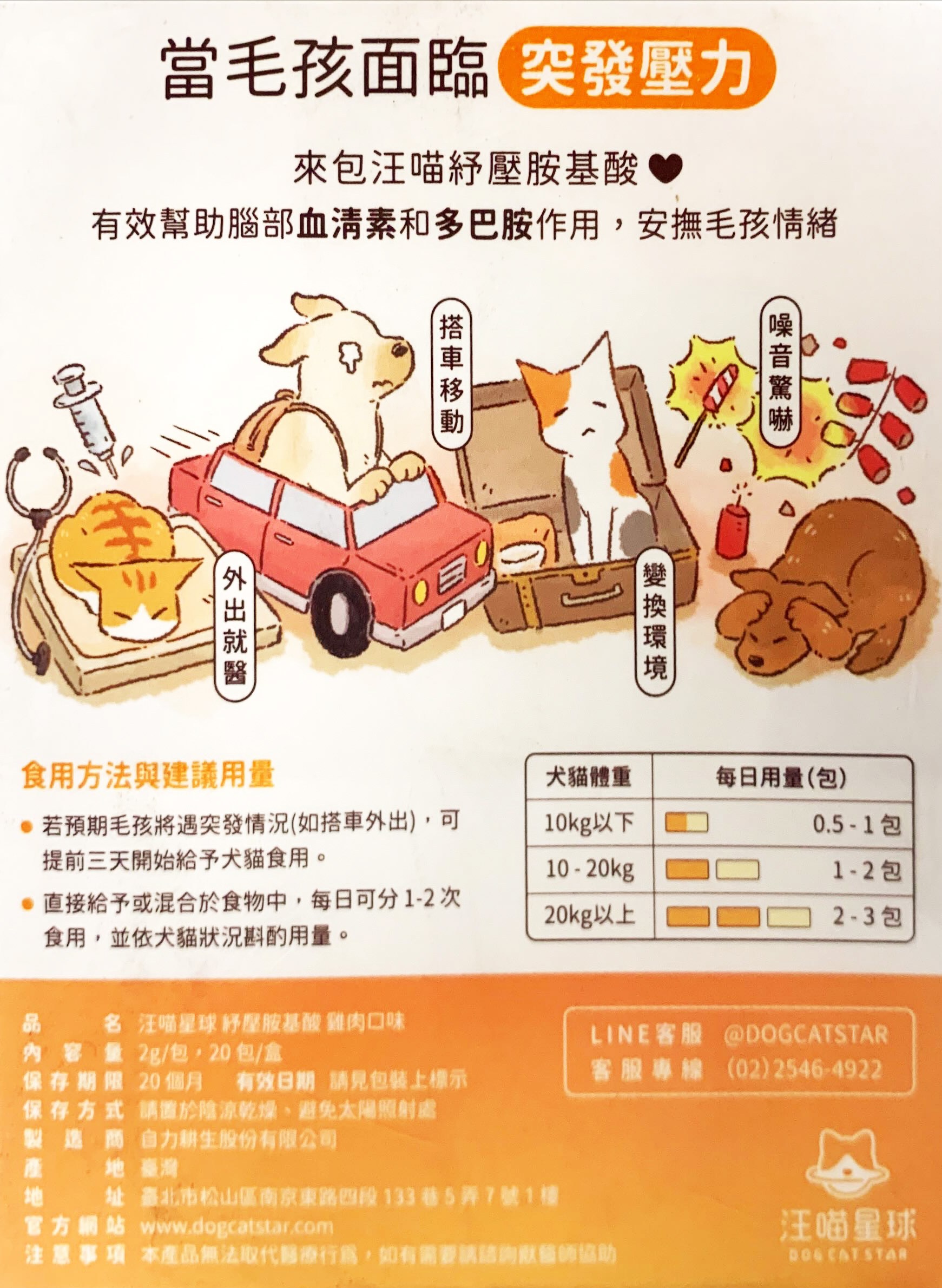DOG CAT STAR 汪喵星球 紓壓胺基酸,是專為犬貓設計的雞肉口味營養補充品,每盒包含20包2公克的粉狀胺基酸,有助於舒緩寵物因環境變化、搭車或新成員加入等突發狀況所產生的壓力。本產品結合四大胺基酸,能有效穩定情緒、幫助注意力集中,讓您的愛寵在面對壓力時也能保持平靜與放鬆。雞肉口味更提升了嗜口性,讓挑嘴的貓狗也能輕鬆接受,是您呵護毛孩身心健康的理想選擇。