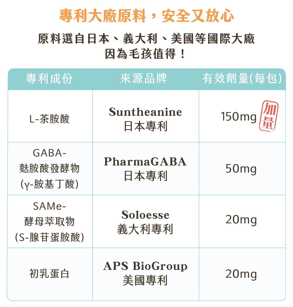 - 每包含有精準劑量的胺基酸,確保您的寵物獲得最佳的舒壓效果,安心無憂。