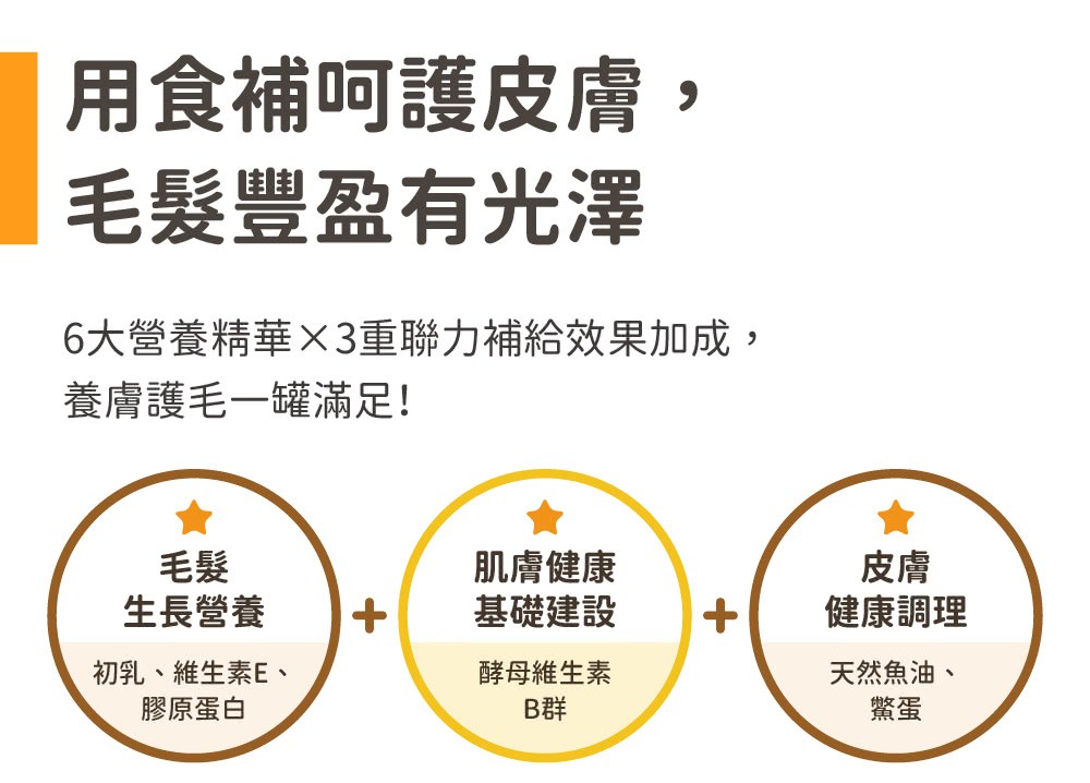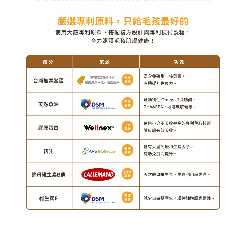 - 添加膠原蛋白,有助於維持皮膚彈性,讓毛孩的肌膚水潤飽滿,散發青春活力。
