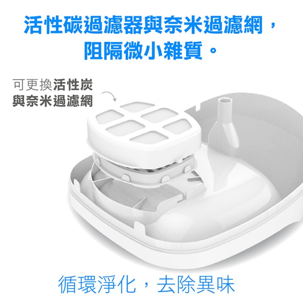 - 活性碳與奈米過濾網雙重作用,能有效阻隔微小雜質,提供寵物更乾淨的飲水環境。