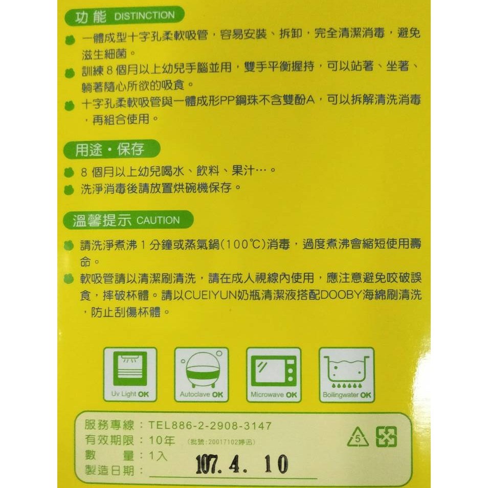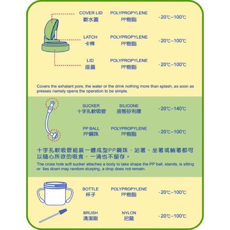- 雙手柄設計,符合人體工學,寶寶容易抓握,訓練手部肌肉發展,學習獨立自主喝水。