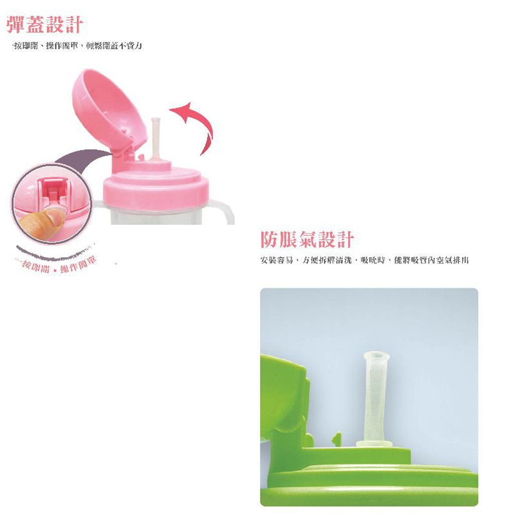 - 彈跳杯蓋設計,輕輕一按即可打開,方便寶寶隨時補充水分,養成良好飲水習慣。