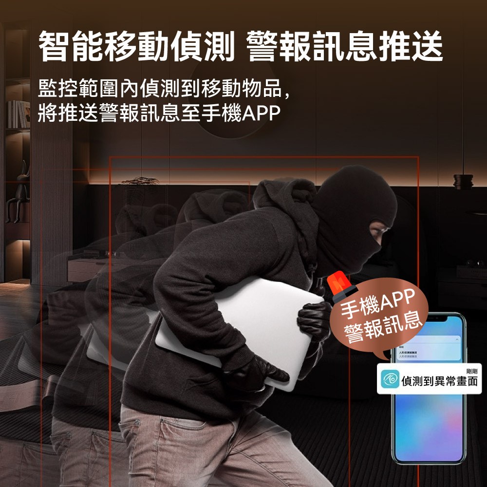 - 具備智能移動偵測功能,一旦監控範圍內有物體移動,立即推送警報訊息至您的手機APP,隨時掌握狀況。
