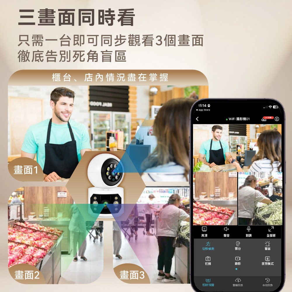DTAudio 聆翔三畫面家用監視器採用先進的雙鏡頭設計,可同時監控和錄影兩個區域,告別監控死角。具備400萬像素,畫面清晰,不錯過任何細節。內建智能移動偵測功能,可將警報訊息即時推送到手機APP,讓您隨時掌握家中或店內狀況。支援雙向語音對講,溝通零距離。此外,它還具備廣角旋轉功能,可全方位監控,讓您安心無憂。