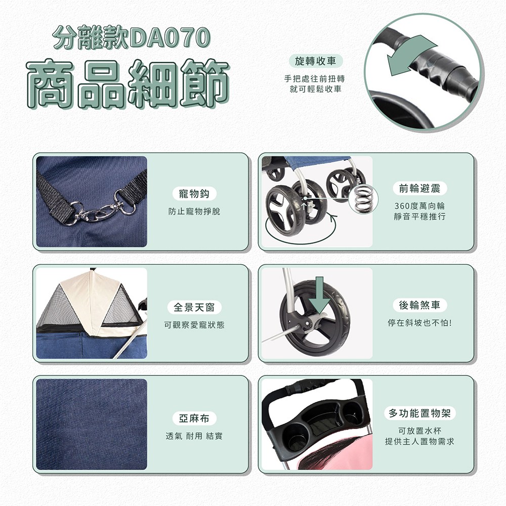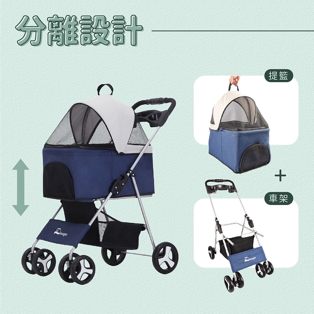 - 分離式設計讓提籃與車架輕鬆拆卸,方便攜帶寵物外出,隨時轉換使用情境。