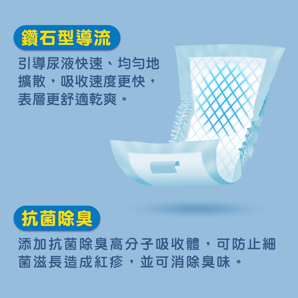 - 鑽石型導流設計,快速均勻吸收尿液,保持表面乾爽,避免濕悶不適,提升舒適度。