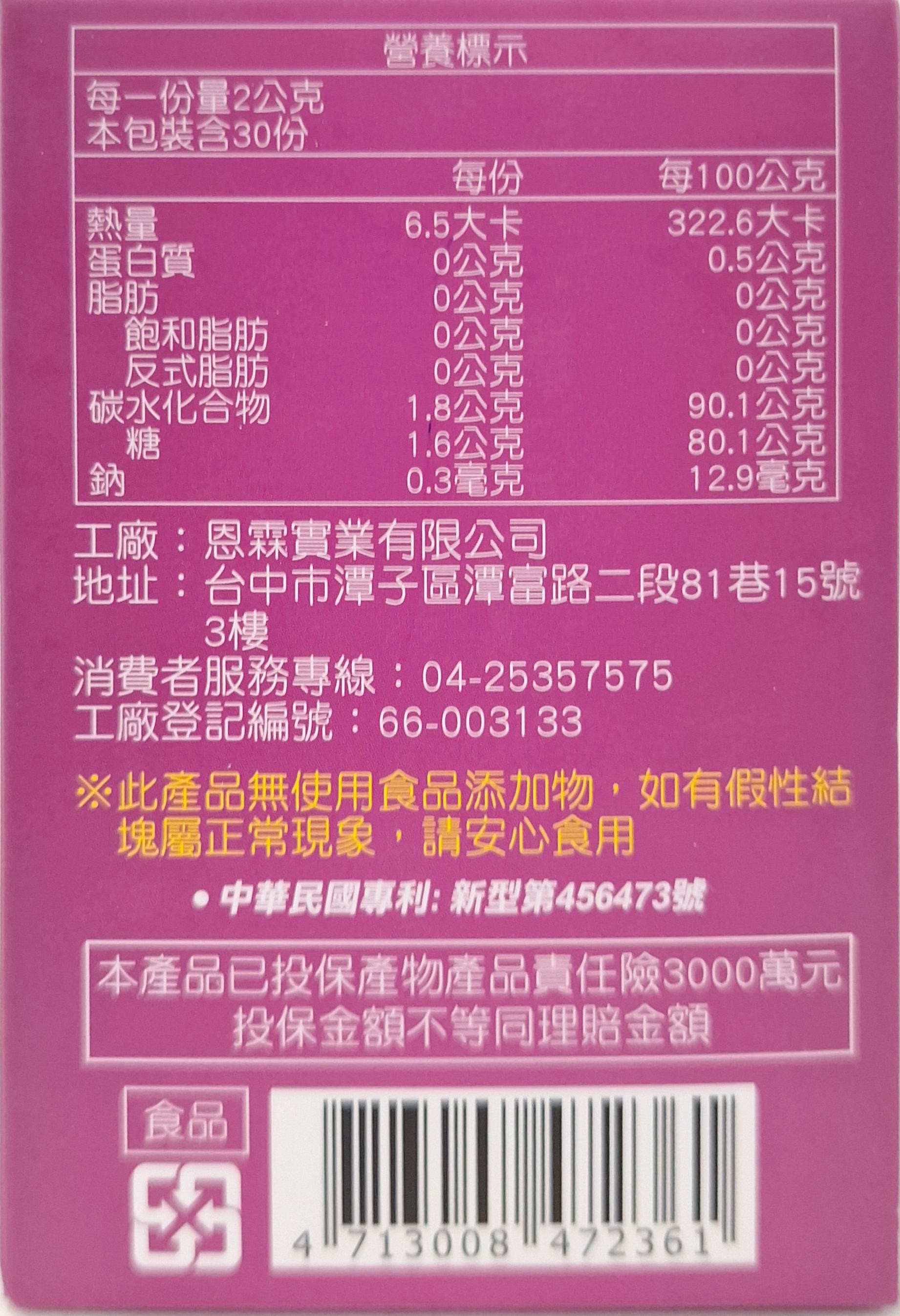 - 內容物: 波森莓果汁粉(乳糖、波森莓濃縮汁)、菊苣纖維、乳酸菌粉(麥芽糊精)