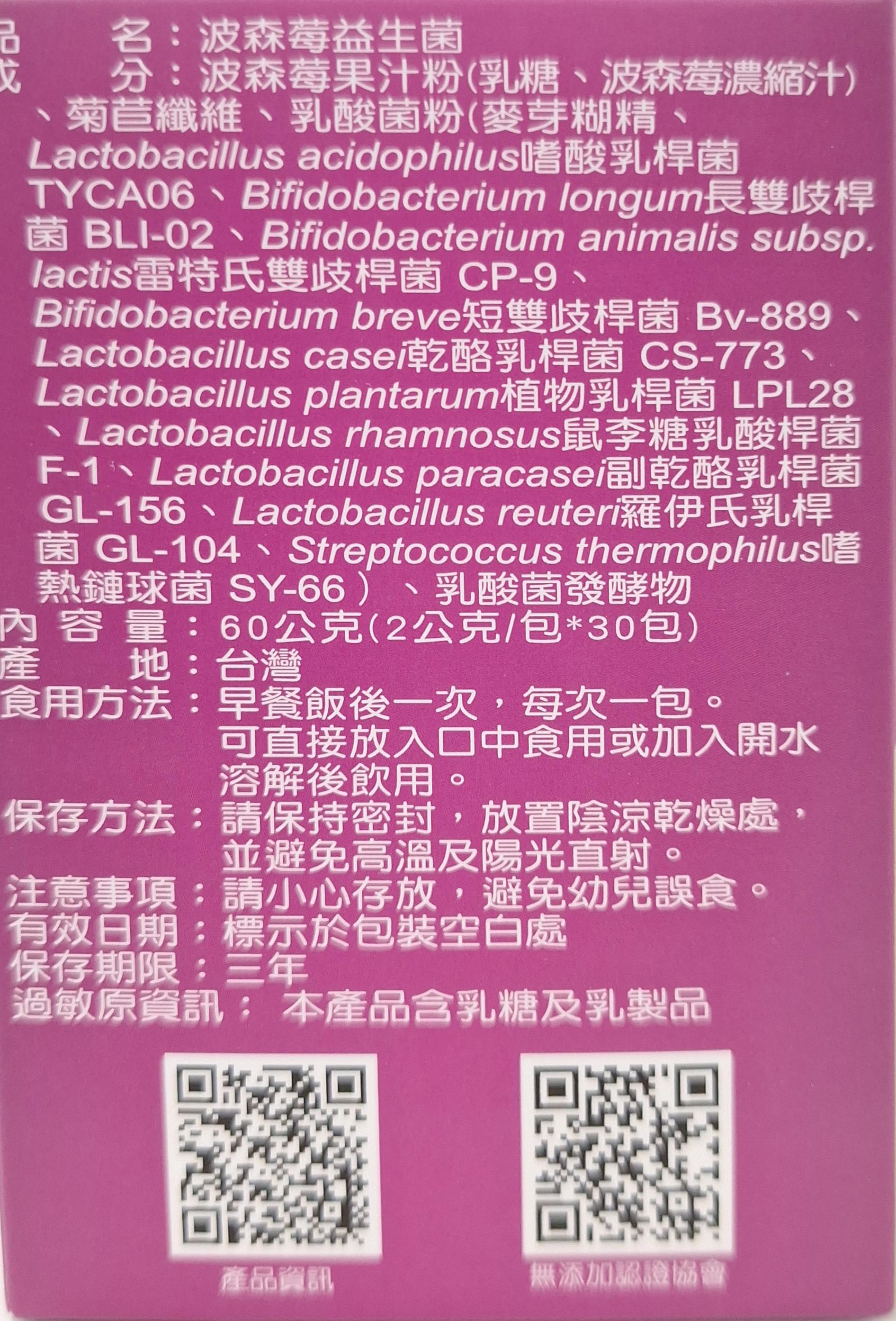 | 投保產品責任險字號 | 07字第062212A00210號 | 成分 | 波森莓果汁粉(乳糖、波森莓濃縮汁)、菊苣纖維、乳酸菌粉(麥芽糊精、Lactobacillus acidophilus嗜酸乳桿菌TYCA06、Bifidobacterium longum長雙歧桿菌 BLI-02、Bifidobacterium animalis subsp.lactis雷特氏雙歧桿菌 CP-9、Bifidobacterium breve短雙歧桿菌 Bv-889、Lactobacillus casei乾酪乳桿菌 CS-773、Lactobacillus plantarum植物乳桿菌 LPL28、Lactobacillus rhamnosus鼠李糖乳酸桿菌F-1、Lactobacillus paracasei副乾酪乳桿菌GL-156、Lactobacillus reuteri羅伊氏乳桿菌 GL-104、Streptococcus thermophilus嗜熱鏈球菌 SY-66)、乳酸菌發酵物 |