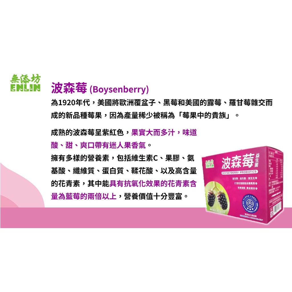 ENLIN 恩霖 無添坊 波森莓益生菌,每盒包含30包2克的獨立包裝,方便攜帶與食用。這款益生菌採用珍貴的波森莓,富含多種營養素,如維生素C、膳食纖維和花青素,有助於提升身體的抗氧化能力。產品不含人工添加物,通過國際A.A.無添加三星認證,讓您安心食用。每日一包,可直接入口或加入開水溶解後飲用,幫助維持消化道機能,讓您由內而外散發健康光彩。