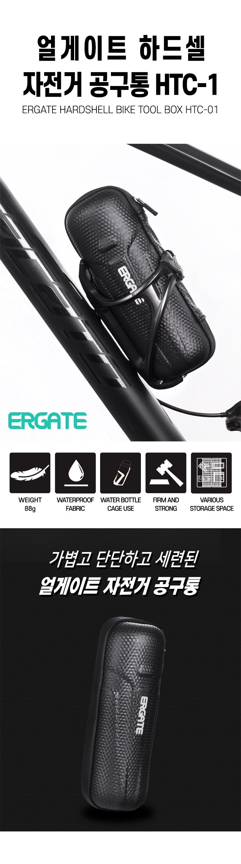 ERGATE 自行車工具包 HTC-01 是一款輕巧、堅固且時尚的工具箱,專為騎行愛好者設計。它採用防水材質和防水拉鍊,有效防止雨水滲入,保護您的工具。內部的多樣化三口袋收納空間,方便您整理各種單車工具,讓騎行更加順暢。此外,它還配備了鎖定拉鍊,可消除騎行中拉鍊頭的晃動和噪音。此工具箱可安裝在水壺架上,方便攜帶,是您騎行時的理想選擇。