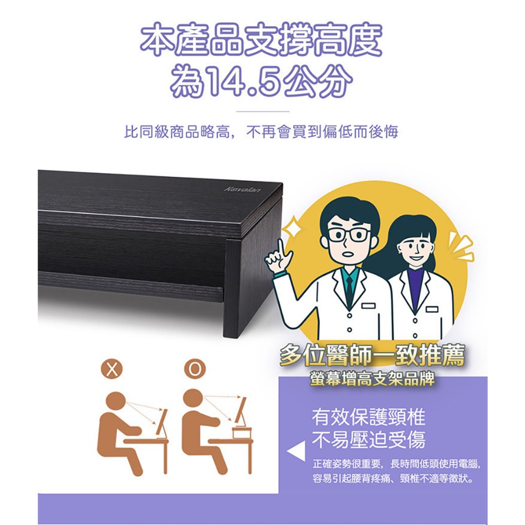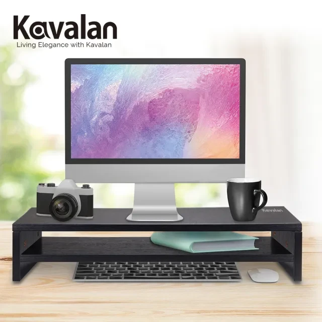 Kavalan 木質螢幕固定雙層增高架,為您的工作空間帶來優雅與實用性。這款增高架採用黑橡木製成,結構穩固,可有效提升螢幕高度,改善坐姿,減輕頸椎壓力,讓您長時間工作也能保持舒適。雙層設計不僅能放置螢幕,還能收納鍵盤、滑鼠等辦公用品,使桌面更加整潔。簡約的設計風格,易於組裝,能完美融入各種居家或辦公環境,提升整體空間質感。產品經過嚴格品質檢驗,安全可靠,讓您安心使用。