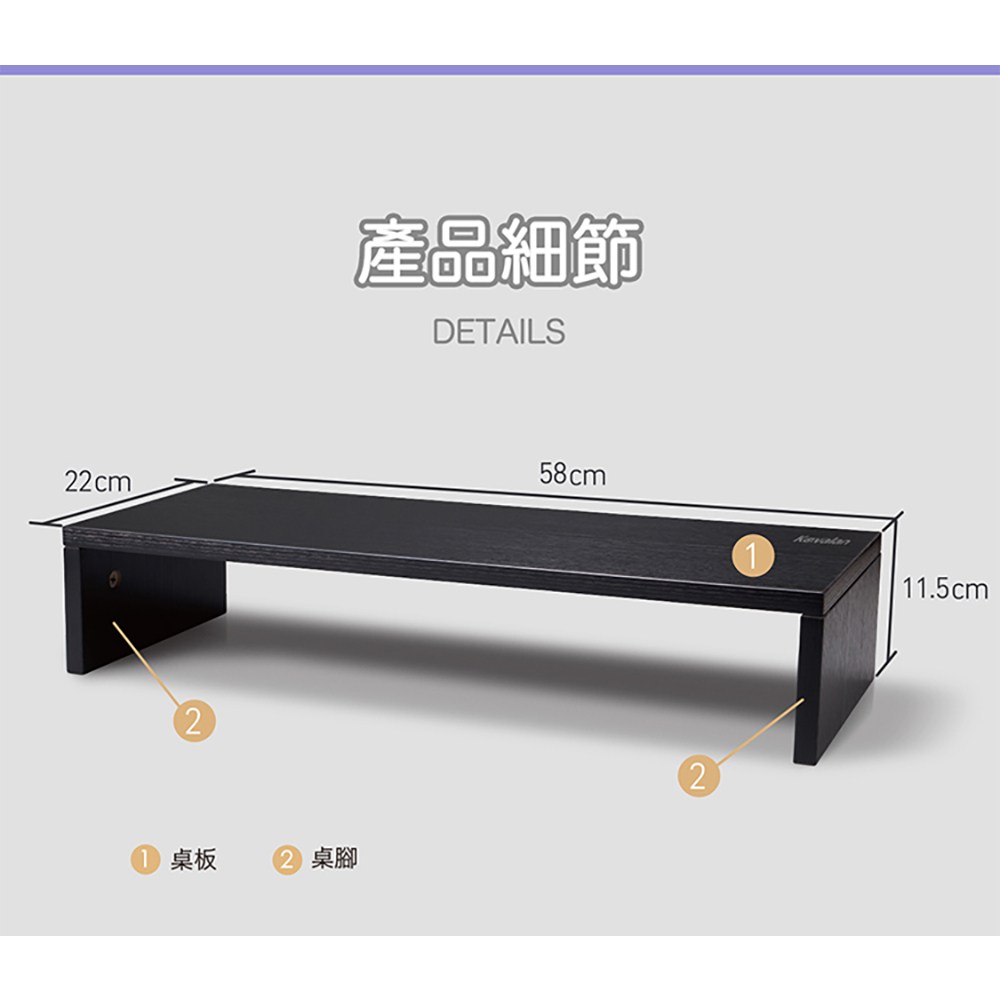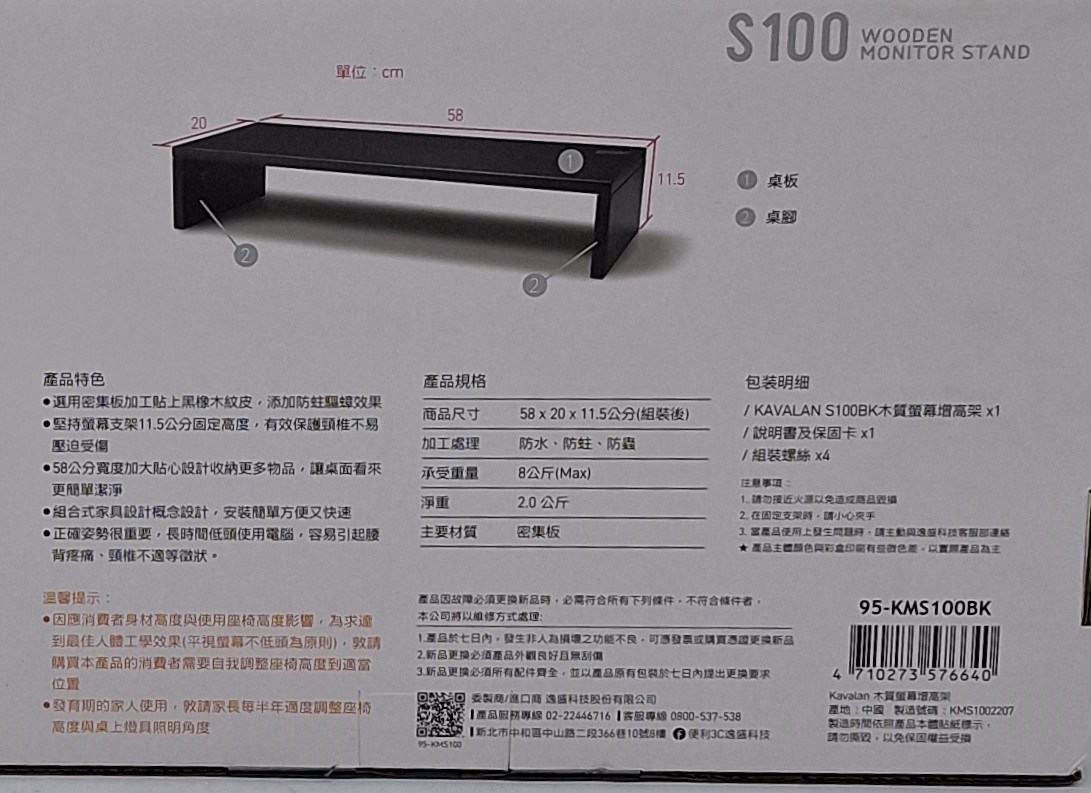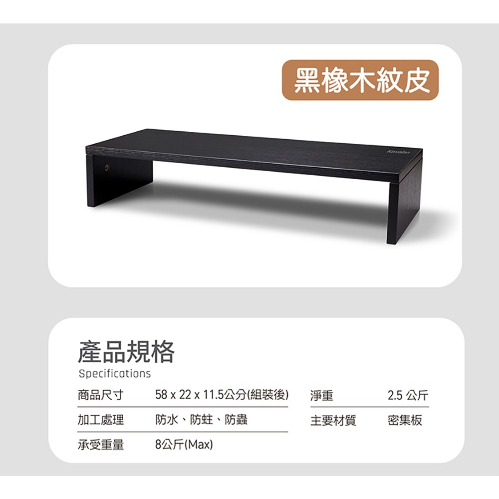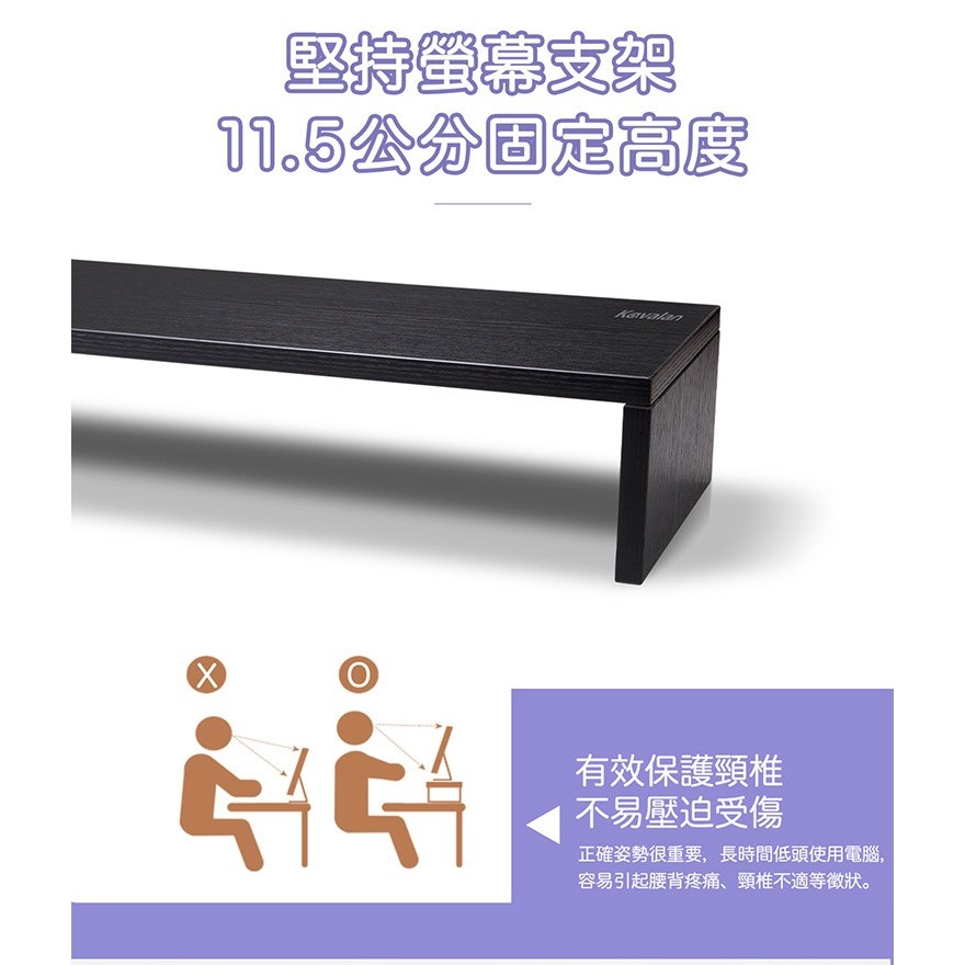 Kavalan S100 黑橡木螢幕支架,為您的桌面帶來簡約時尚的風格,同時提升工作效率。此款支架採用優質木質材料製成,結構穩固,可承重達 8 公斤,適用於各種尺寸的螢幕。11.5 公分的高度設計符合人體工學,能有效改善坐姿,減輕頸椎壓力,讓您長時間工作也能保持舒適。58 公分的寬度提供充足的置物空間,可收納鍵盤、滑鼠等桌面小物,讓桌面更加整潔。黑橡木色系沉穩大方,能完美融入各種居家或辦公環境。