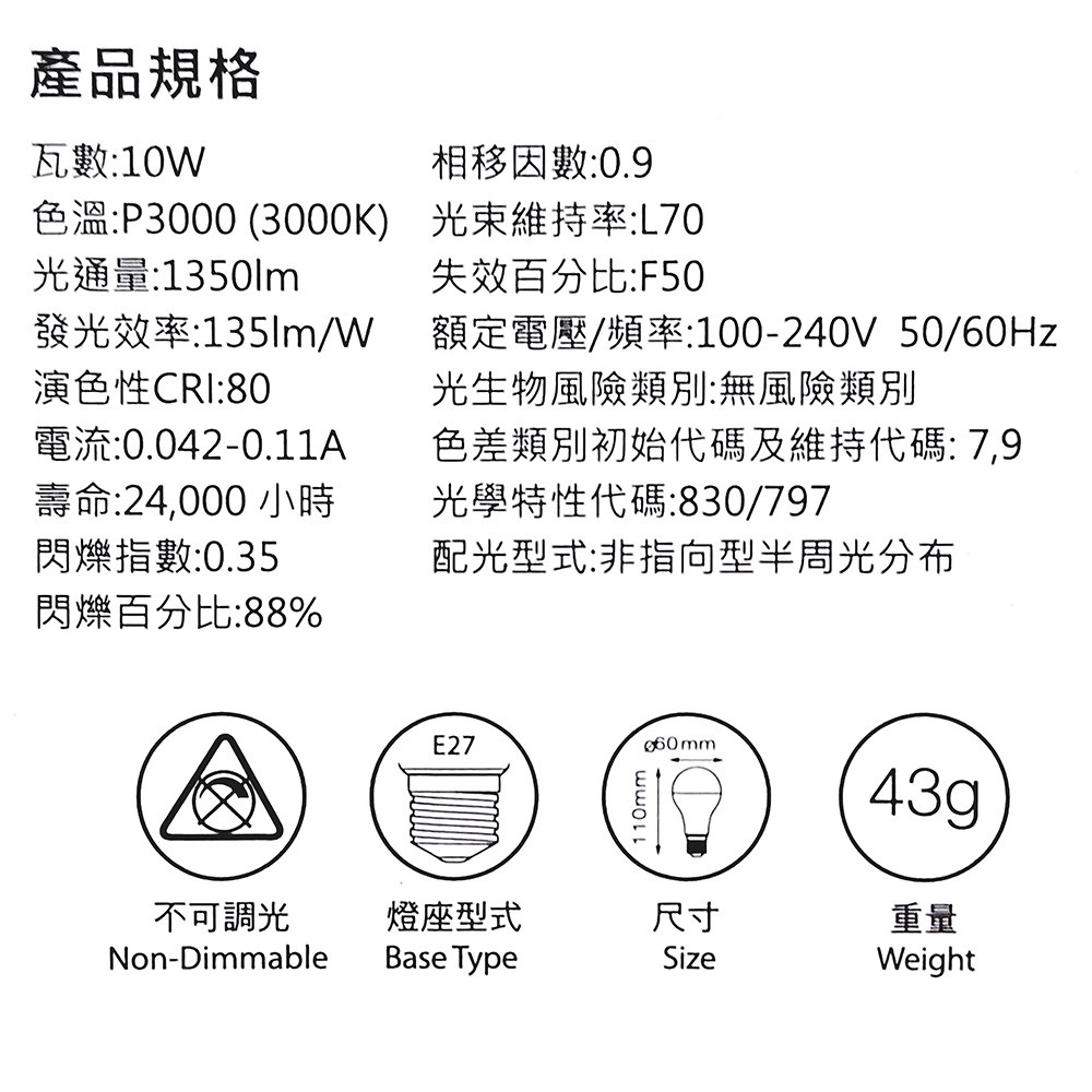 - 10W的LED燈泡亮度足夠,可取代傳統燈泡,提供明亮且節能的照明效果。