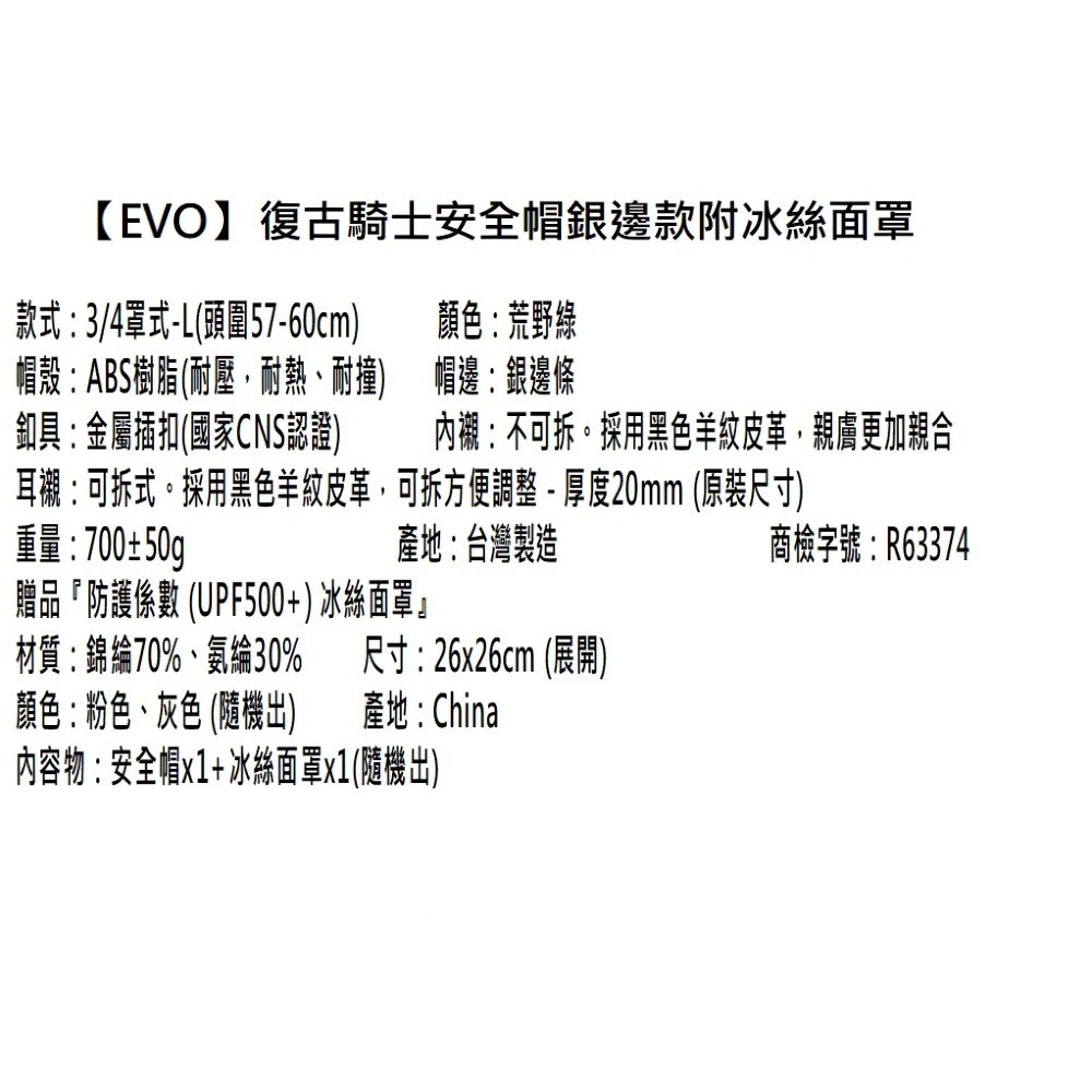 EVO復古騎士安全帽,以經典3/4罩造型結合現代安全技術,提供騎士全面的保護。荒野綠配色搭配銀邊設計,展現獨特風格品味。L尺寸適合頭圍57-60cm,男女皆宜。帽體採用ABS樹脂,耐壓耐熱耐撞,內襯採用黑色羊紋皮革,親膚舒適。附贈冰絲面罩,提升騎乘舒適度。