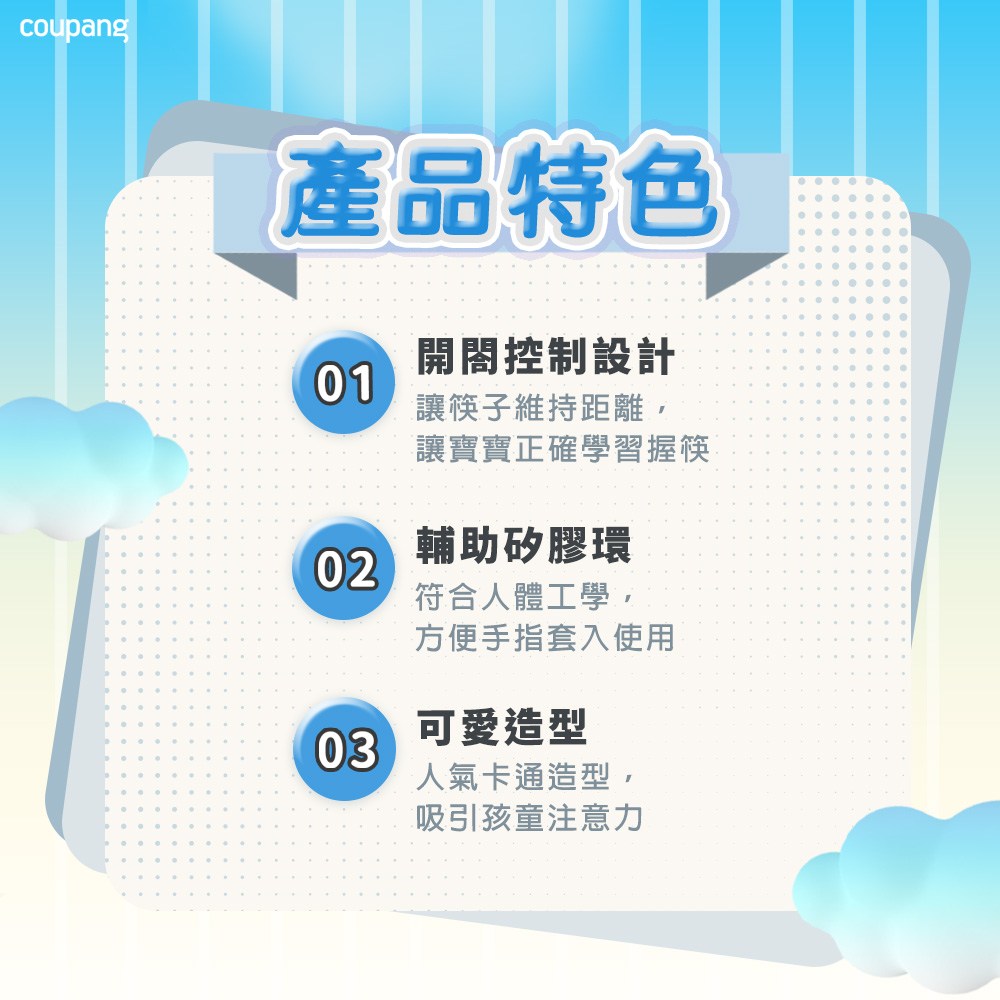- 符合人體工學的輔助矽膠環,讓孩子輕鬆掌握正確握筷姿勢,快速上手。
