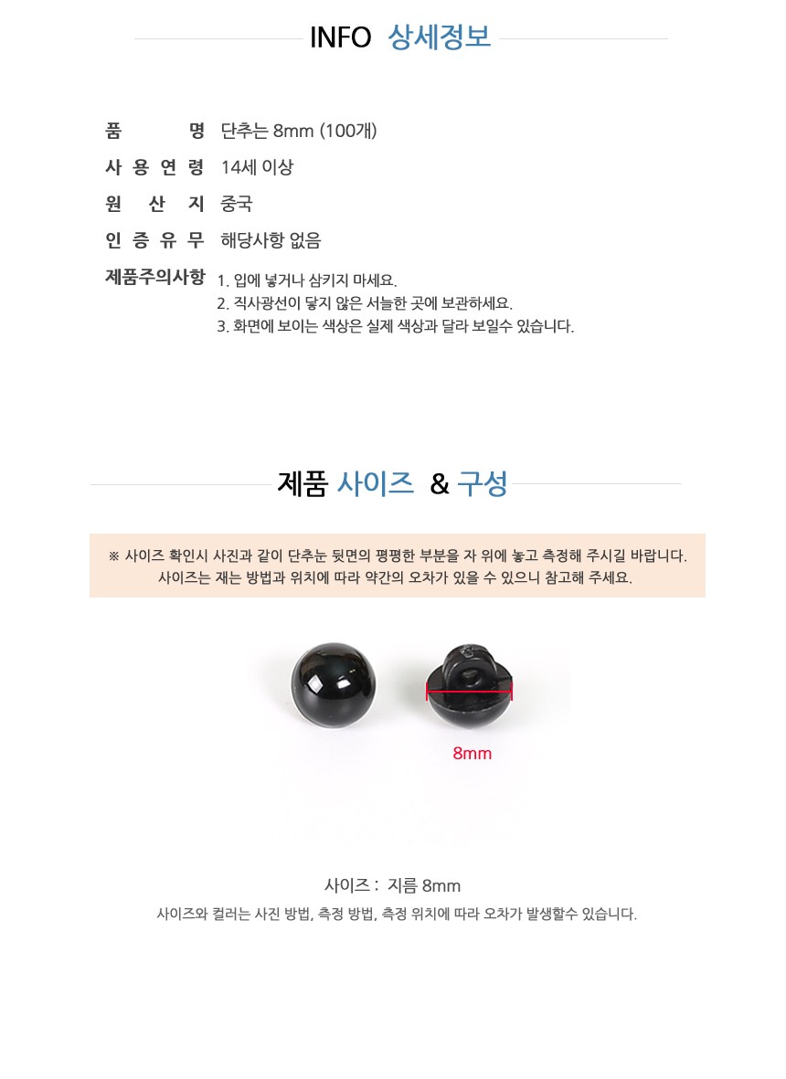 這款FELT79 Pelteuchingu鈕扣眼是手工藝愛好者的理想選擇。鈕扣眼尺寸為8mm,每包含約100個,數量可能略有差異。黑色設計簡約百搭,適用於各種娃娃和手工藝品的眼睛裝飾。使用時請注意,本產品不適合14歲以下兒童使用,並請存放在陰涼處,避免陽光直射。背面孔洞尺寸可能因進貨批次而略有不同,購買時請留意。
