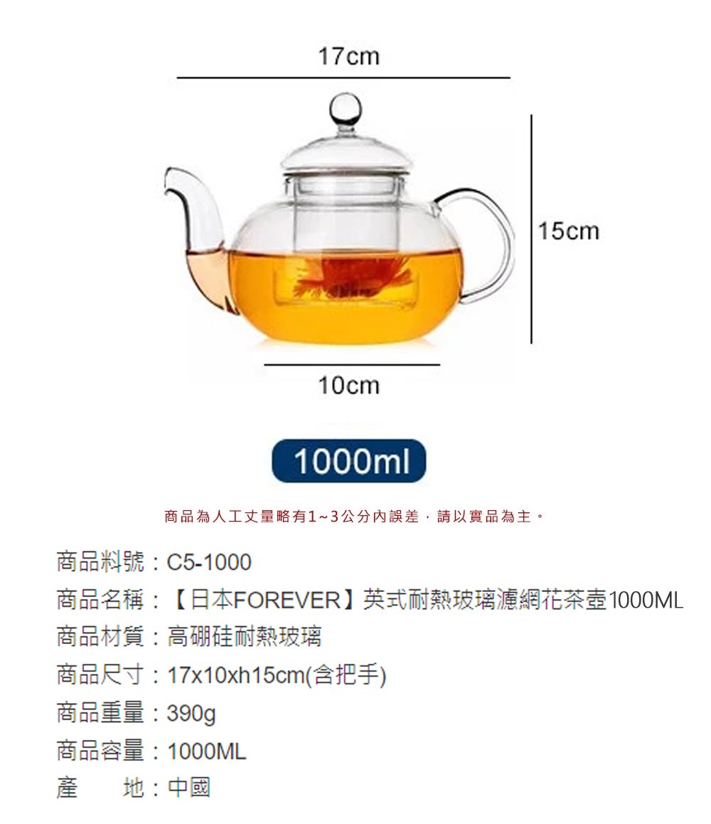 FOREVER 英式耐熱玻璃濾網花茶壺,容量1公升,讓您輕鬆享受品茗時光。採用高硼硅耐熱玻璃製成,安全耐用,冷熱皆宜。內置濾茶網,方便過濾茶葉,讓茶湯清澈無雜質。透明壺身設計,可欣賞茶葉舒展的美態,增添品茗樂趣。無論是沖泡花茶、綠茶或紅茶,都能完美呈現茶的色香味,是您居家或辦公室的理想選擇。