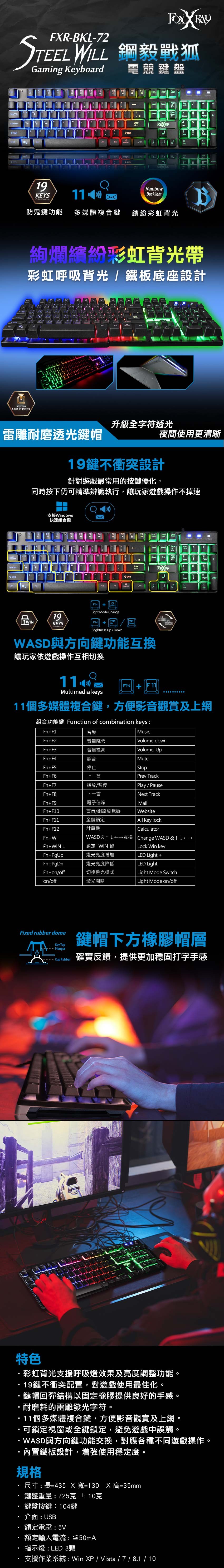 FOXXRAY 狐鐳 鋼毅戰狐電競鍵盤,型號FXR-BKL-72,為您帶來極致的遊戲體驗。這款黑色鍵盤採用炫彩背光設計,提供多種呼吸燈效果及亮度調整,讓您的遊戲空間更加個性化。19鍵不衝突配置,確保在激烈的遊戲中也能精準執行每個指令。鍵帽回彈結構以固定橡膠圈提供良好的手感,長時間使用也不易疲勞。此外,內置鐵板設計增強了鍵盤的穩定性,讓您在遊戲中更加得心應手。11個多媒體複合鍵,方便影音觀賞及上網,WASD與方向鍵功能交換,對應各種不同遊戲操作。