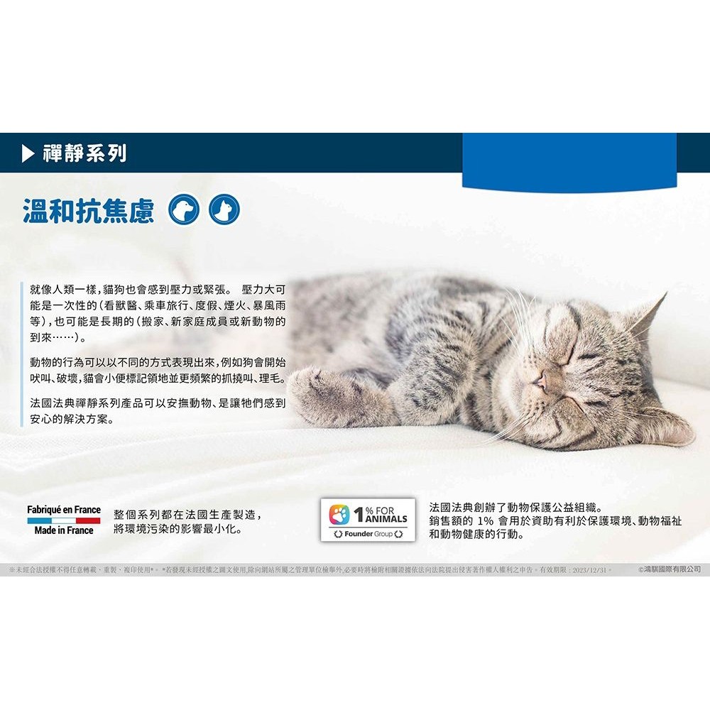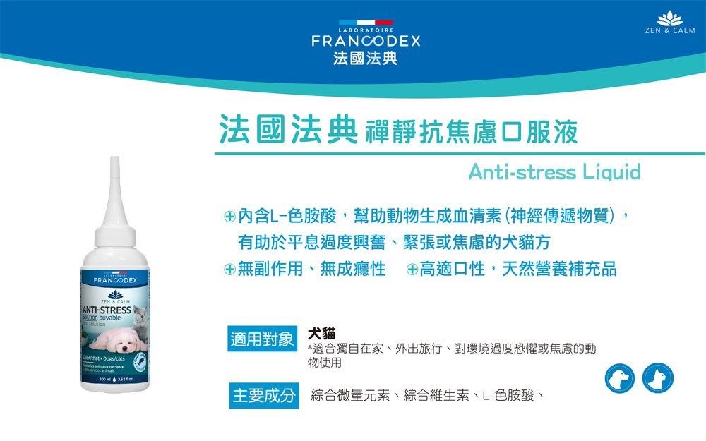 法國法典禪靜抗焦慮口服液,專為舒緩犬貓的緊張與焦慮情緒而設計,有助於寵物在面對壓力環境時保持平靜,如獨自在家、外出旅行或環境變化等。口服液中富含L-色胺酸、綜合維生素及微量元素,調節情緒,無副作用及成癮性,且適口性佳,讓您的愛寵輕鬆享受寧靜與放鬆。本產品經嚴格品質檢驗,安全可靠,是您呵護寵物情緒健康的理想選擇。