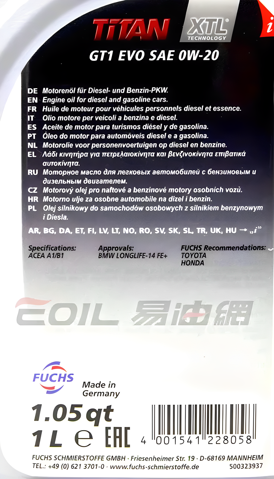 FUCHS TITAN GT1 EVO XTL 0W-20 全合成機油,為您的愛車提供卓越的引擎保護與性能提升。這款1公升裝的頂級機油採用德國先進技術,確保在各種駕駛條件下都能維持引擎的清潔與潤滑,延長引擎壽命。其0W-20的黏度等級,特別適用於需要低黏度機油的現代汽車,有助於提高燃油效率,減少排放。選擇FUCHS TITAN GT1 EVO,讓您的愛車引擎始終保持最佳狀態,體驗更順暢、更強勁的駕駛感受。德國原裝進口,品質保證,值得信賴。