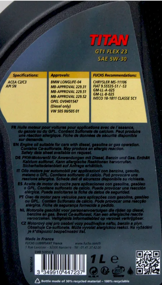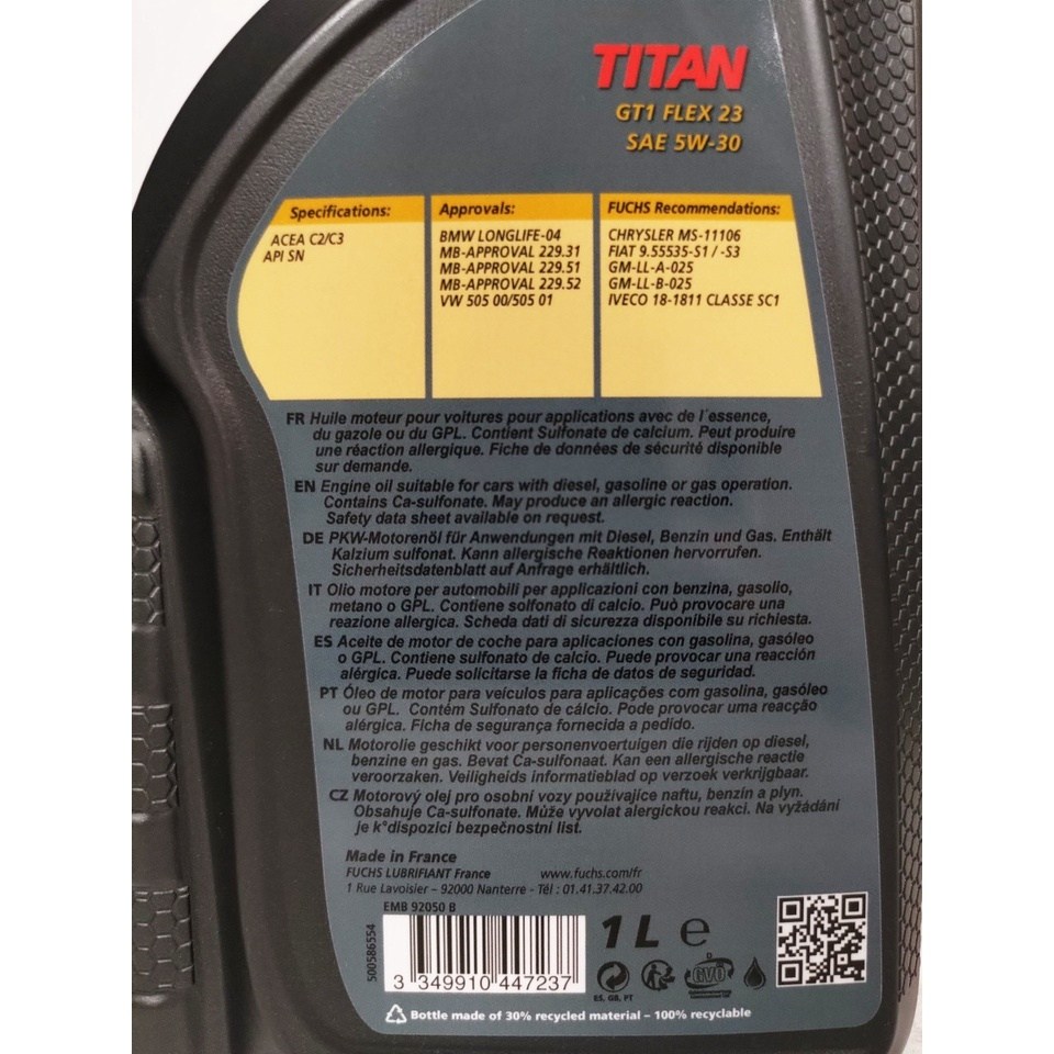 FUCHS TITAN GT1 FLEX 23 5W30 全合成機油,採用德國技術,為您的愛車提供卓越的引擎保護,確保引擎在各種工況下都能順暢運作。其5W30的SAE黏度,提供優異的低溫啟動性能和高溫保護,延長引擎壽命。一公升的容量,方便您隨時補充,維持引擎最佳狀態。選擇FUCHS TITAN GT1 FLEX 23,讓您的愛車引擎保持最佳性能,體驗德國工藝的精湛。